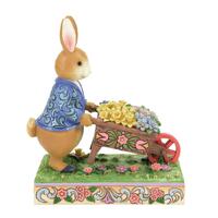 Wearing his signature blue coat, Peter Rabbit pushes a wheelbarrow full of inviting flowers in this beautiful creation. Designed by Jim Shore, the figurine features a wealth of inspired rosemale details, enchanting craftsmanship, and cheerful color.