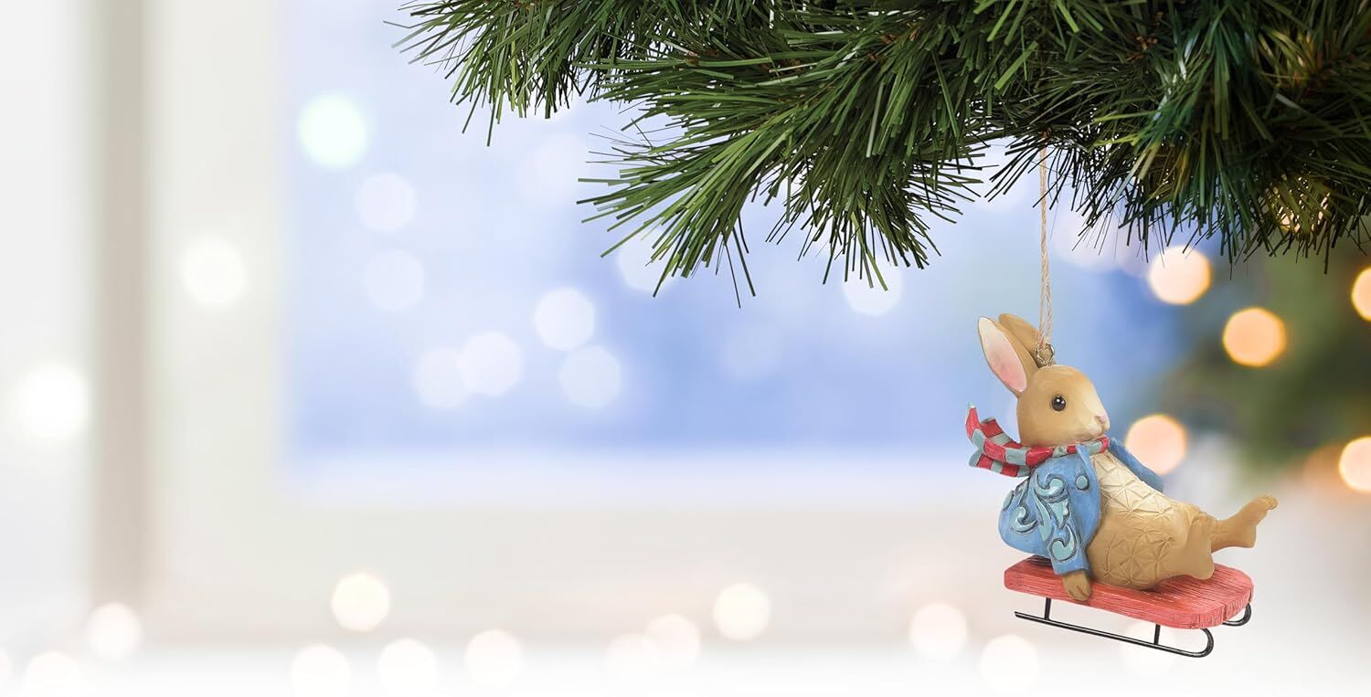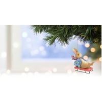 Scarf billowing, Peter Rabbit goes for a ride in this playful ornament by Jim Shore. Hanging tight onto a little red sleigh, Peter flies through your tree with snow day satisfaction. Celebrate your holiday season with Beatrix Potter's sweetest creation.