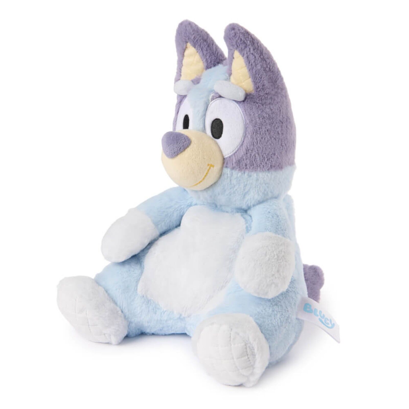 - This understuffed, huggably floppy soft toy features Bluey with accurate characters details including soft blue plush fur, her adorable, bright-eyed expression, and soft quilted accents on