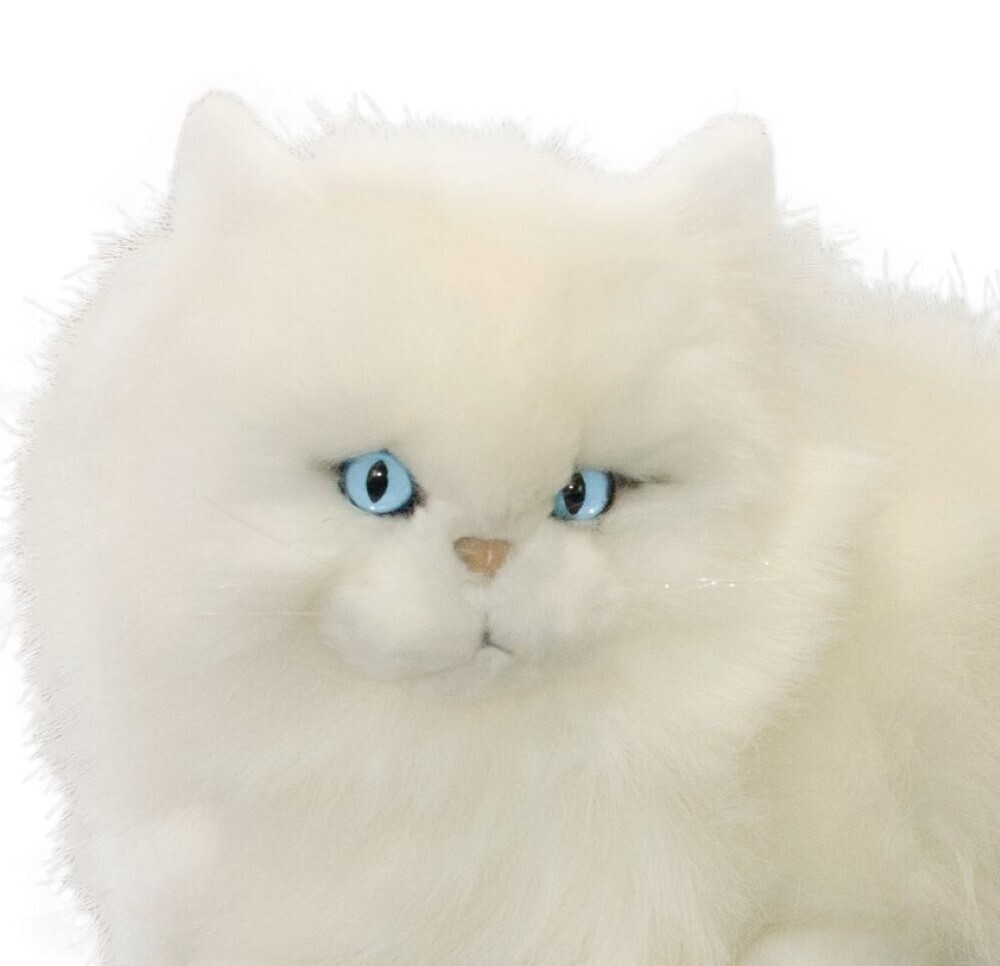 Snowflake is a lying Persian cat in a solid white colour and is a realistic soft plush toy and is a premium quality handmade soft long-haired blue-eyed cat and is very cuddly.  Persians are also known as doll-face Persians.