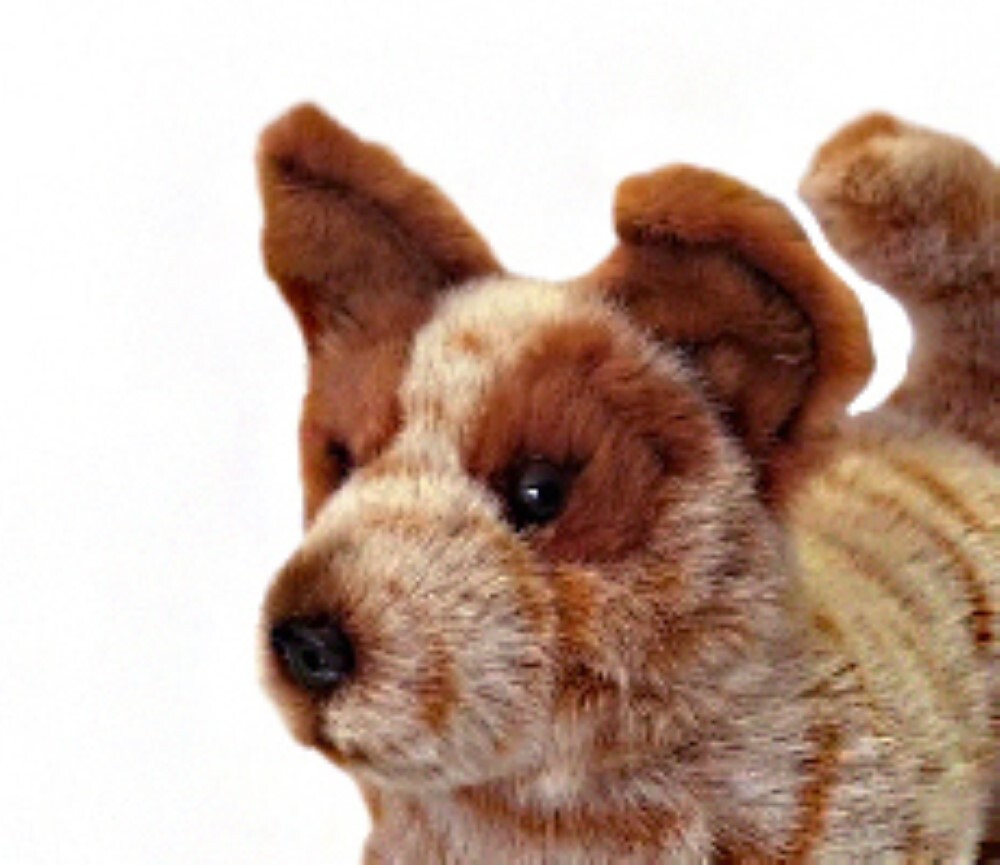 Flame is a really cute realistic handmade lying red Australian Cattle Dog plushie puppy, Red Heeler stuffed plush dog.
