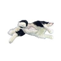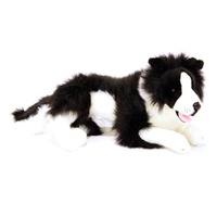 Blitz comes with a zipped satin pocket/pouch and is a really cute realistic almost lifesize stuffed plush Border Collie in black and white.  Our cuddly sheepdog plushie is a quality-made lying soft toy.