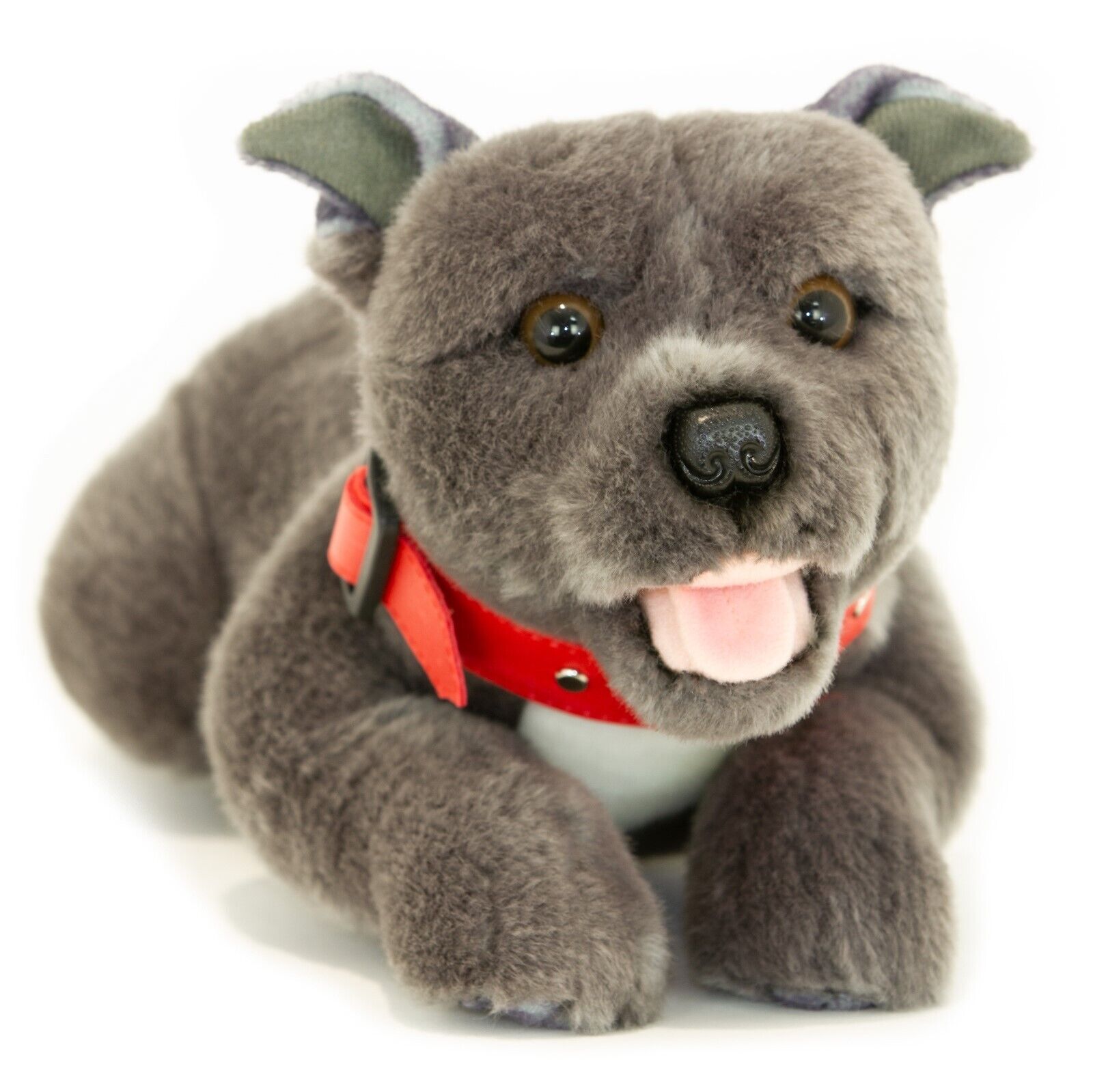 Bullet is an exquisitely soft and realistic handcrafted lying Blue Staffordshire Bull Terrier plush puppy toy.  They are also known as Staffies and this handmade puppy will never grow up so you will have a cuddly soft plushie to always cuddle.