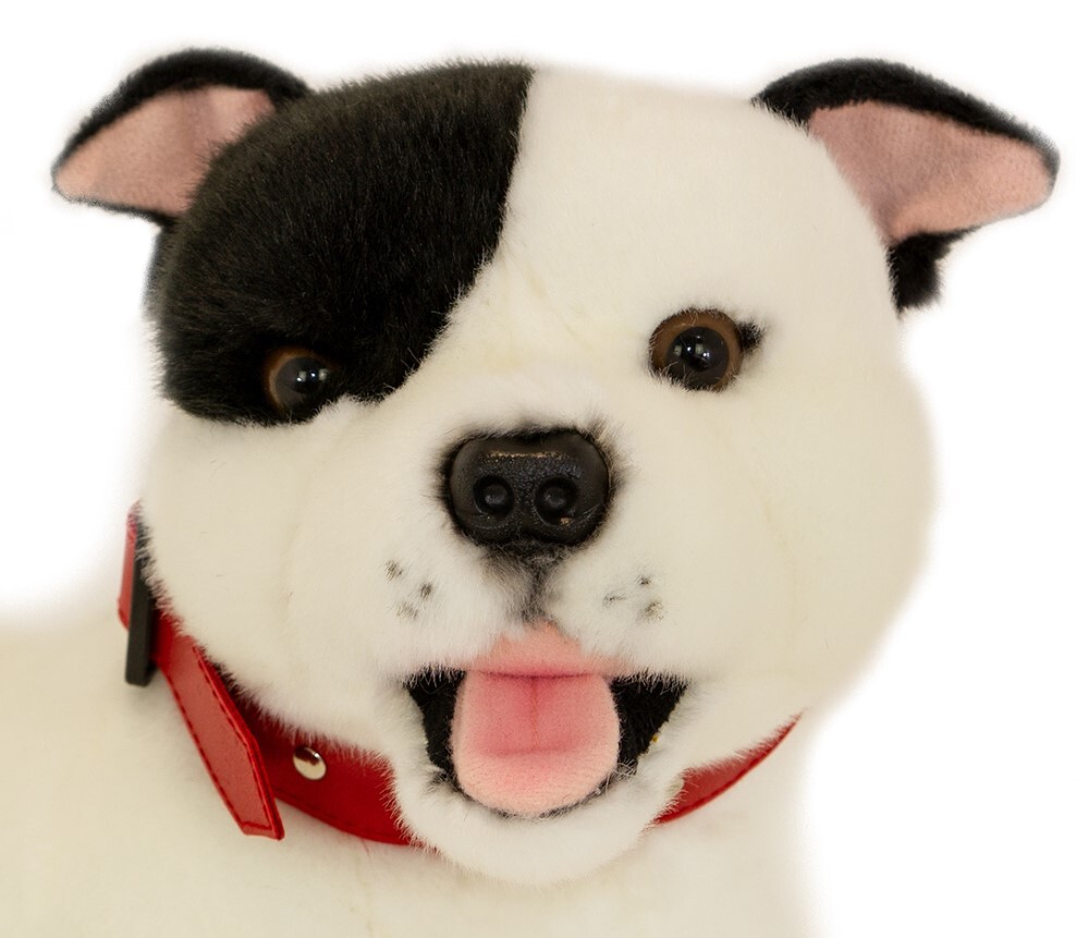 Loki is an exquisitely soft and realistic handcrafted lying white Staffordshire Bull Terrier plush toy with a patch over the eye.