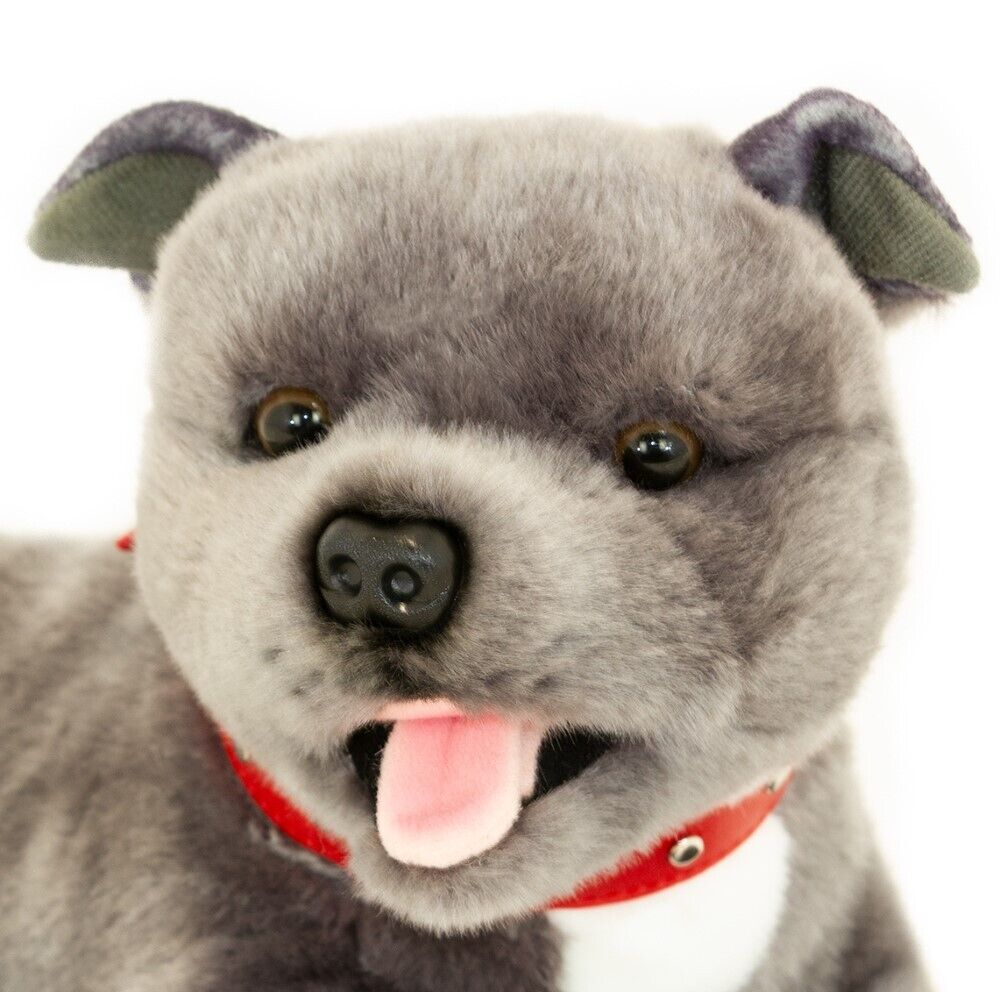 Flint is an exquisitely soft and realistic handcrafted lying Blue Staffordshire Bull Terrier plush toy.