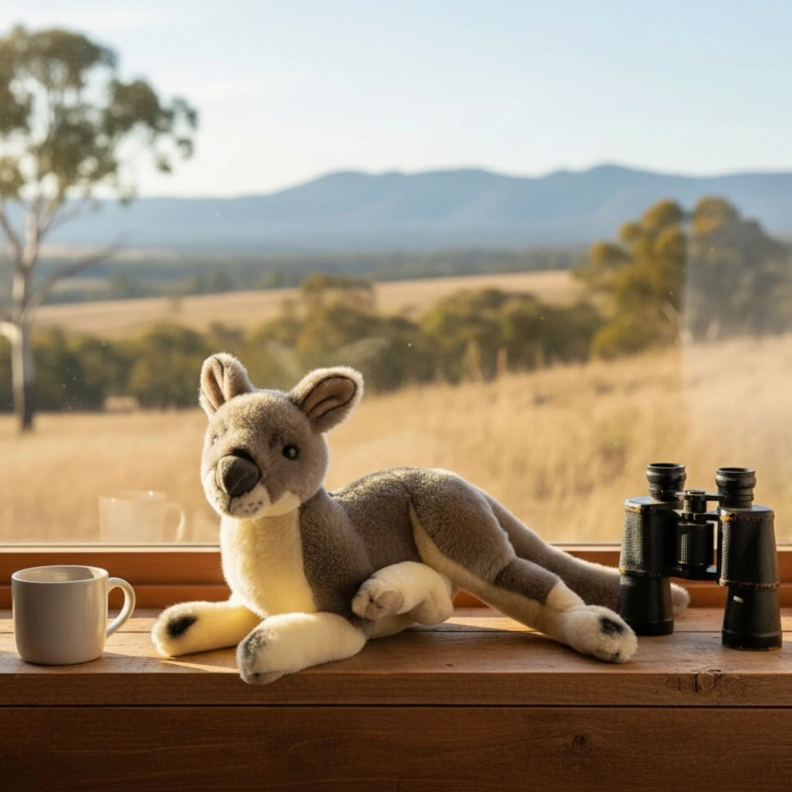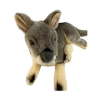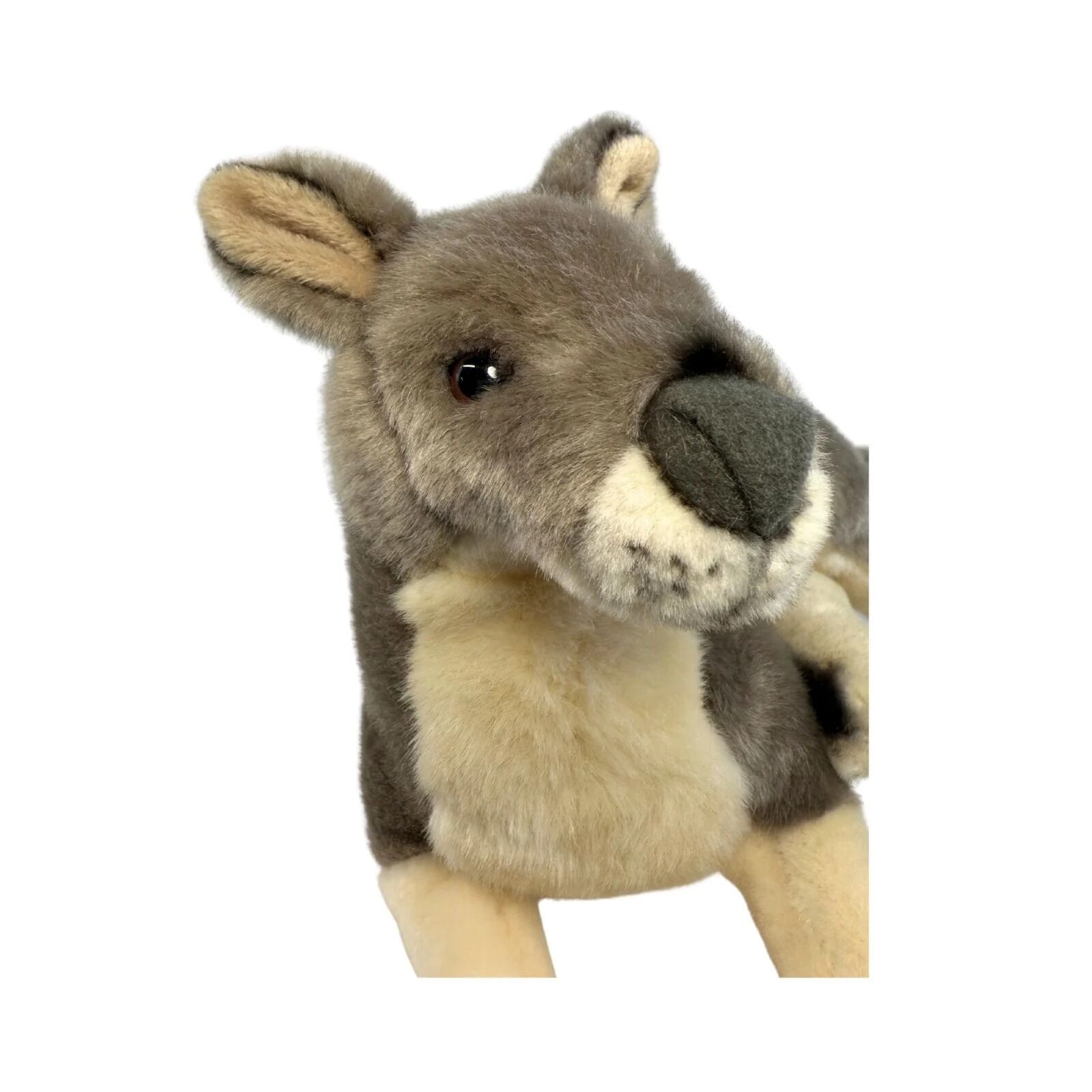 Joy is a lying-down grey kangaroo souvenir plush toy. She is a premium quality handmade soft toy with hand-airbrushed details.
