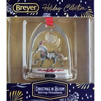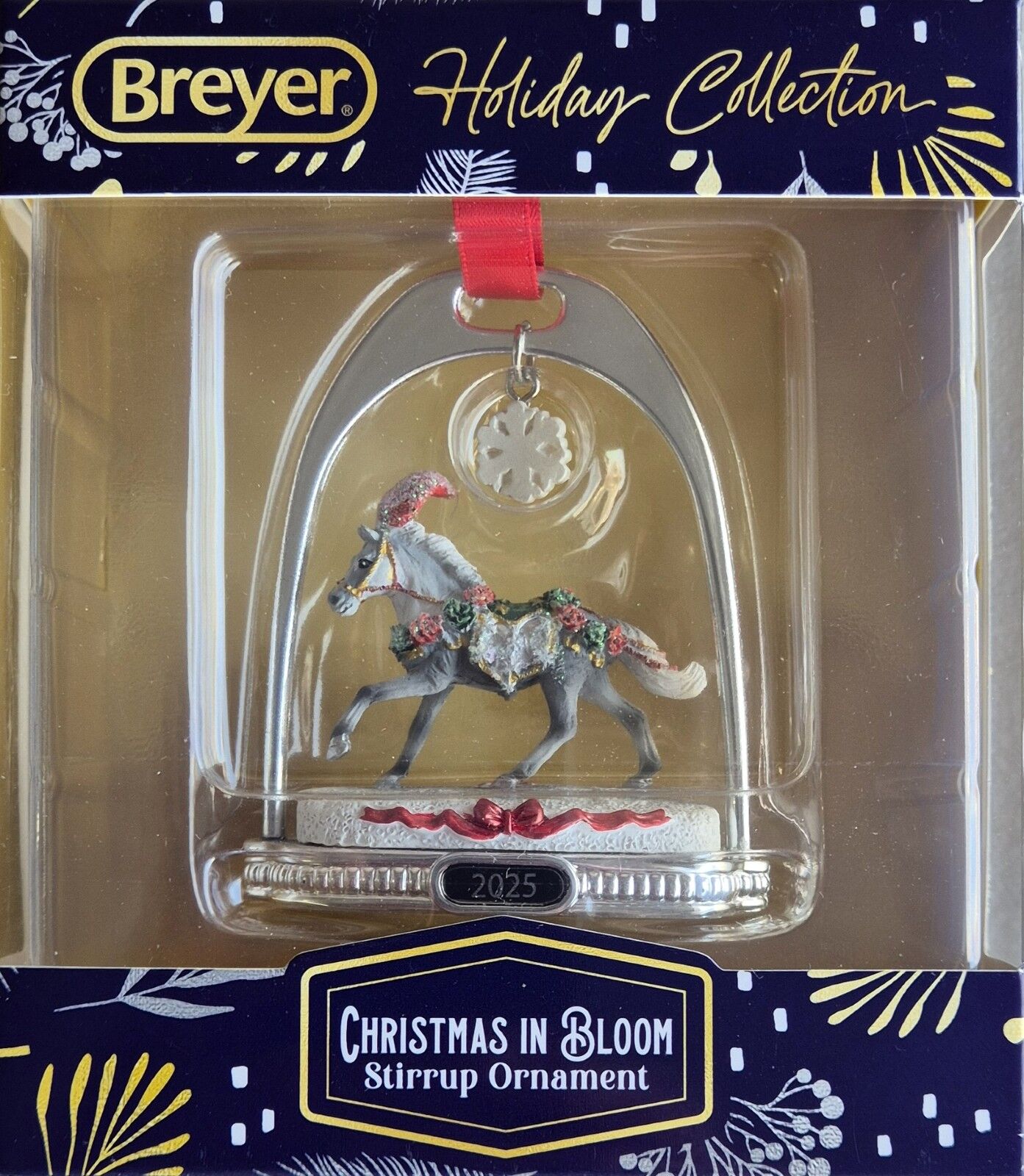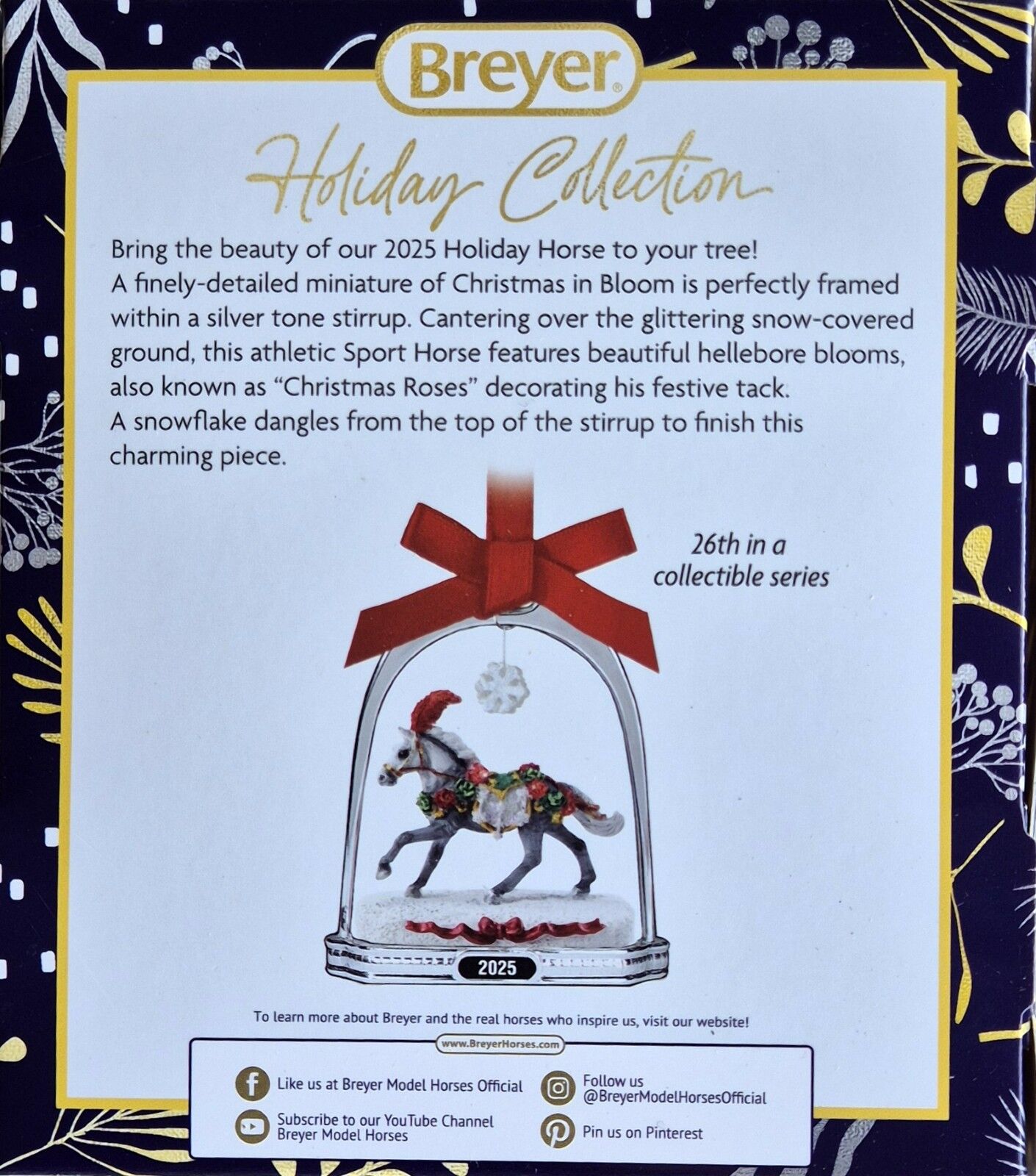 Bring the beauty of our 2025 Holiday Horse to your tree! A finely-detailed miniature 'Christmas in Bloom' is perfectly framed within a silver tone stirrup. This athletic sport horse features beautiful hellebore blooms, also known as "Christmas roses" decorating his festive tack. A snowflake dangles form the top of the stirrup to finish this charming piece.
