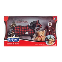 On a brisk winter evening, there’s nothing quite like thick, cozy pajamas and the company of your best friend. Christy, dressed in her warmest onesie and sturdy boots, ventures out to the barn despite the cold wind and flurries. She can’t wait to share her big, fluffy new teddy bear with her pony, Cinders!