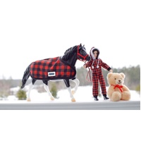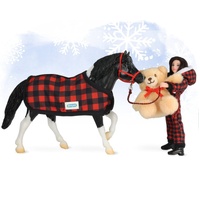 Cinders is watching the snow fall from the window of his softly-bedded stall when Christy enters the barn. He’s snuggled in his new blanket, a special gift from his family so he may match with his favourite little girl. Christy approaches the stall of the tobiano pinto pony with her teddy bear. Cinders, always curious and up for a bit of mischief, gives the bear an affectionate poke with his muzzle - a new friend!