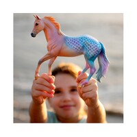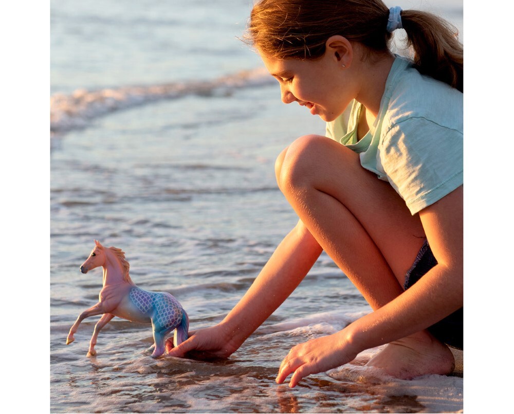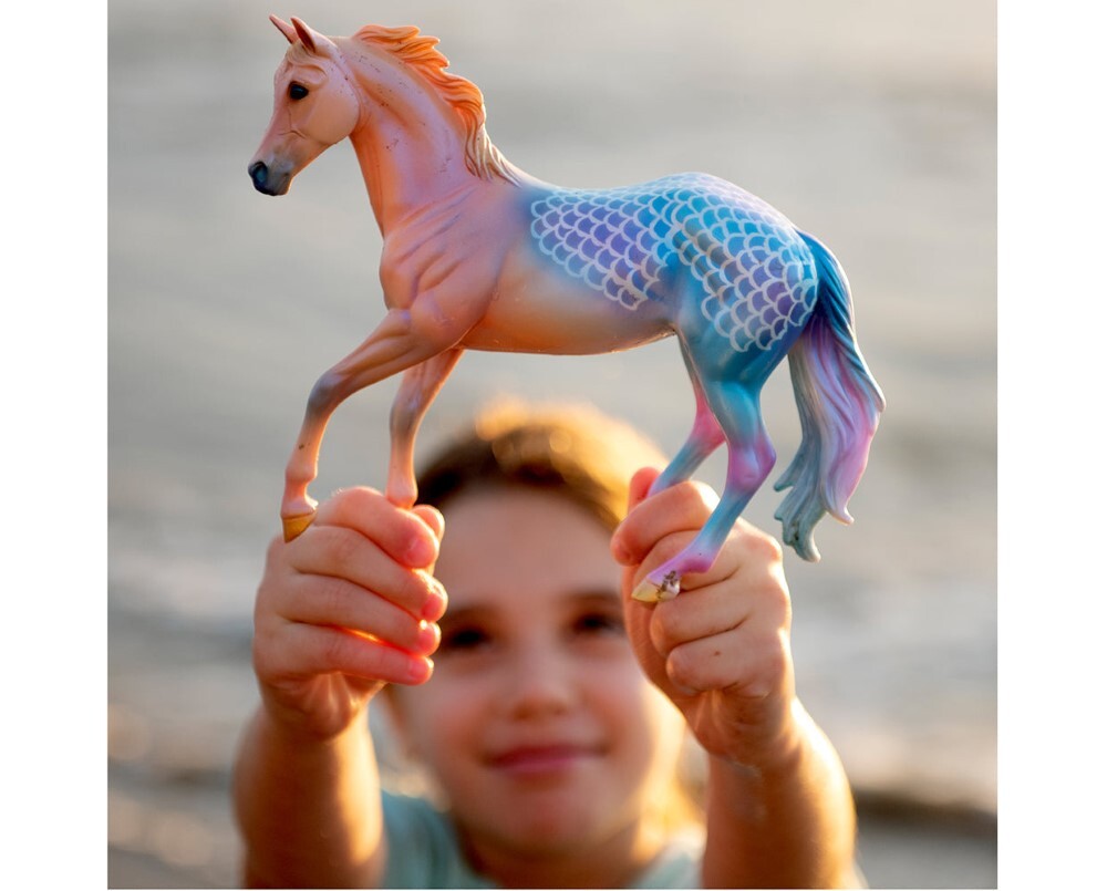 Cora’s pearly pastel coat begins as pinky purple and deepens to a gorgeous inky blue and purple, bringing to mind the natural iridescence and coloring of seashells. Her beautiful look is completed with golden hooves.