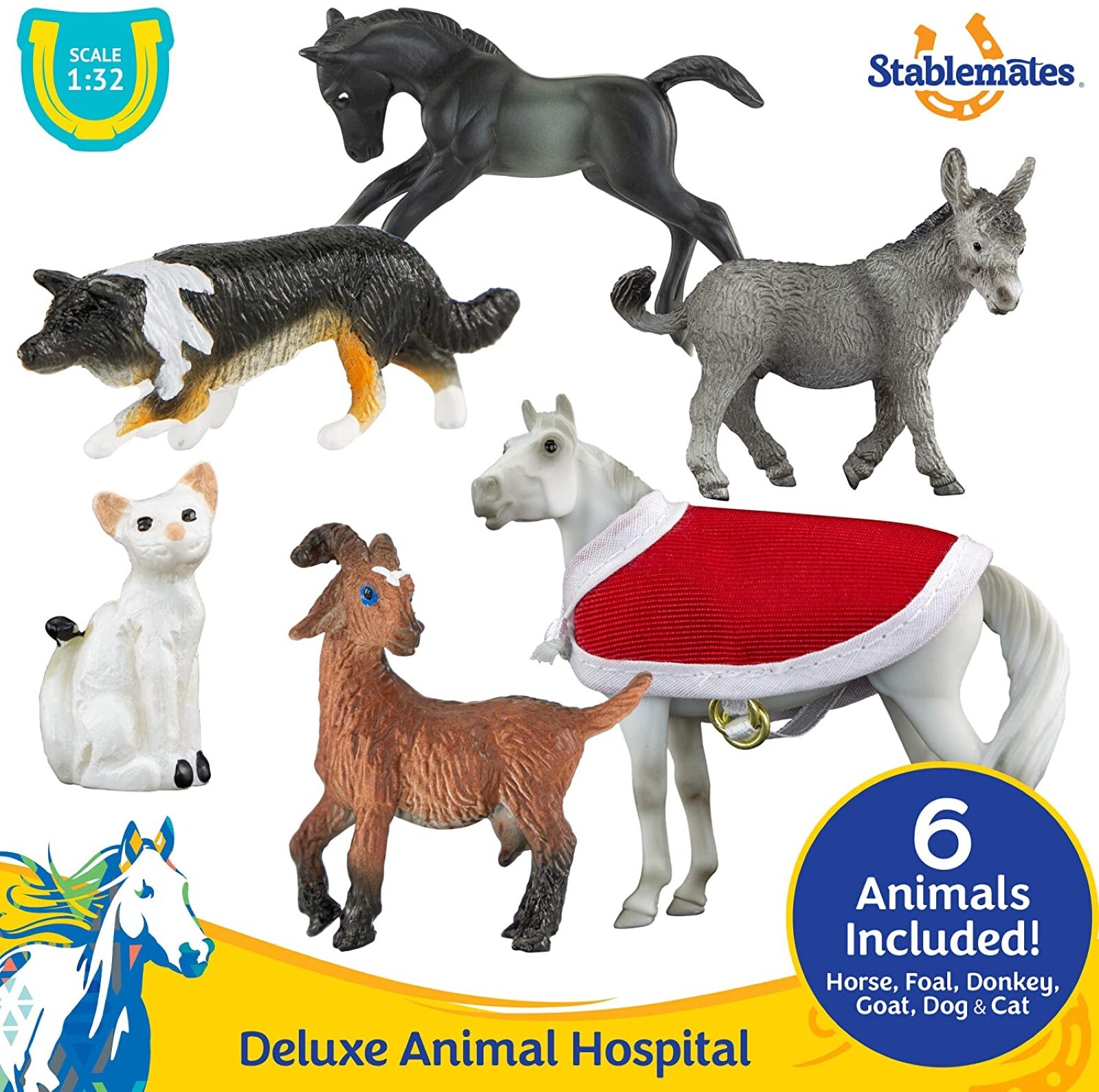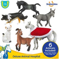 This engaging play set features 6 animals, including a Stablemates Quarter Horse mare and foal, Sicilian donkey, Pygmy goat, Border Collie, and cat, plus a horse blanket, operating table, and bandage box.