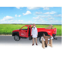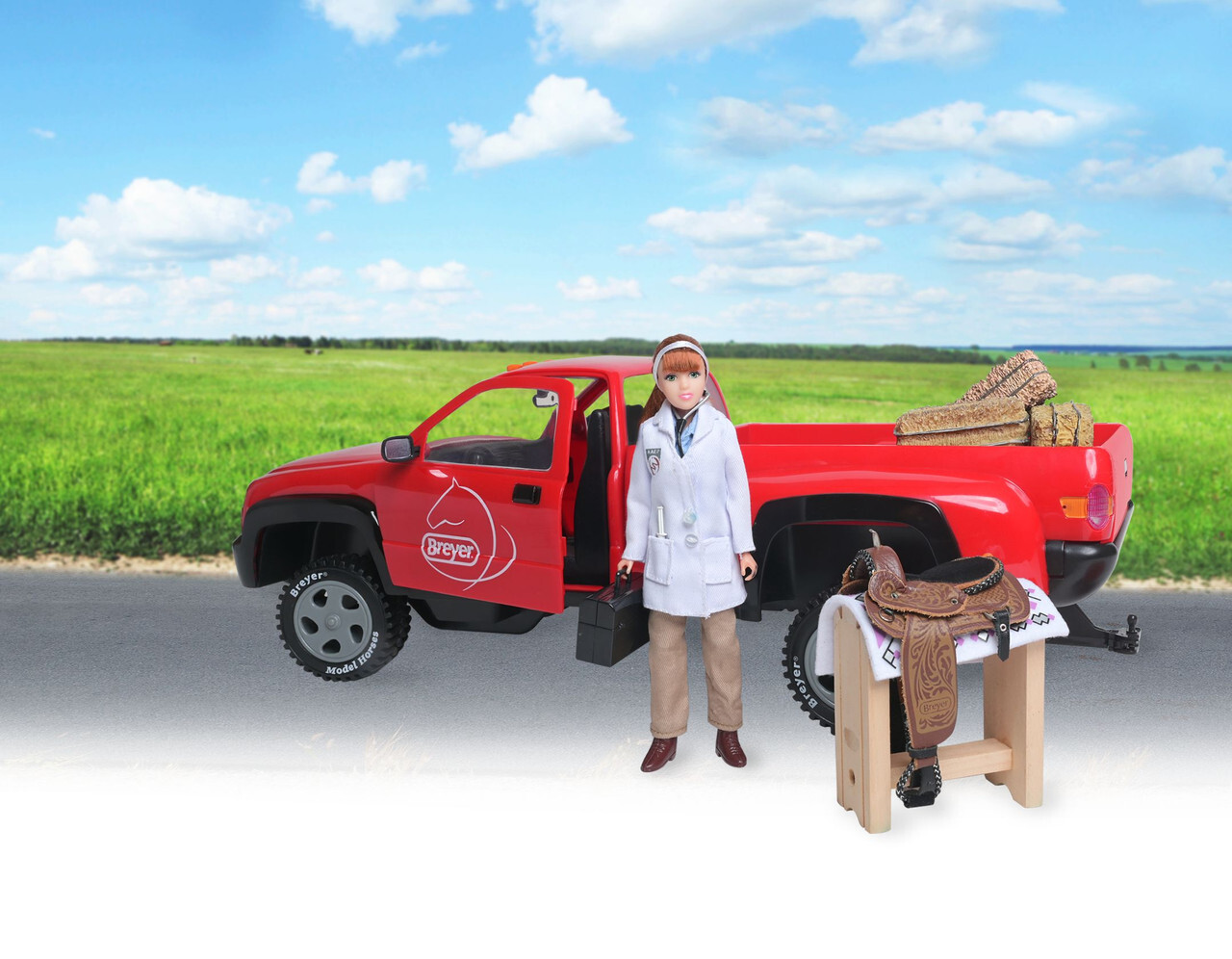 Breyer's "Dually" (for dual-wheeled) Truck hitches up to the matching Horse Trailer in a snap! Beautifully crafted, this super truck has room inside for two of our 8" figures. It includes rolling wheels, working rack-and-pinion steering, doors that open, two side-view mirrors, a working hood, tailgate, and hitch, as well as a sheet of decorative stickers!