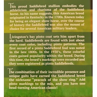 This saddlebred stallion is painted in brown hues with white patches across his lean and muscular body, as well as white stockings and a white stripe on his forehead.