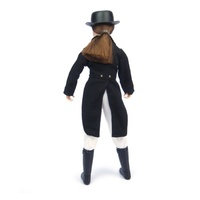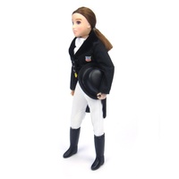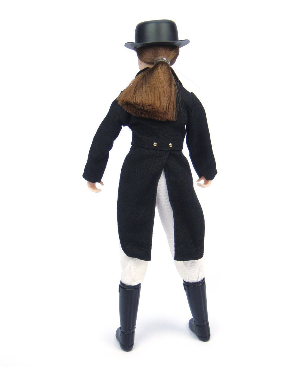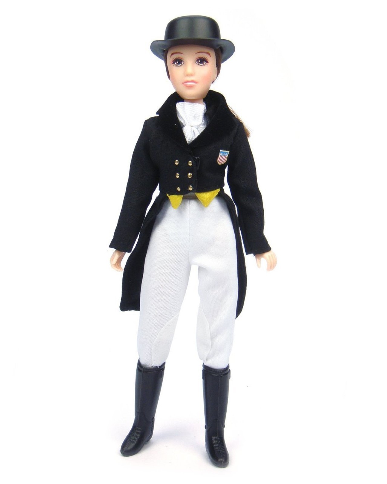 Fully articulated dressage rider Megan is dressed in a formal shadbelly, white show shirt and tie, top hat, white breeches and black boots. Bears U.S. Equestrian Team crest.
