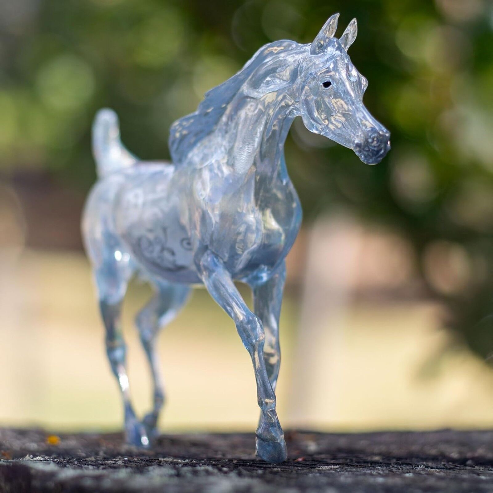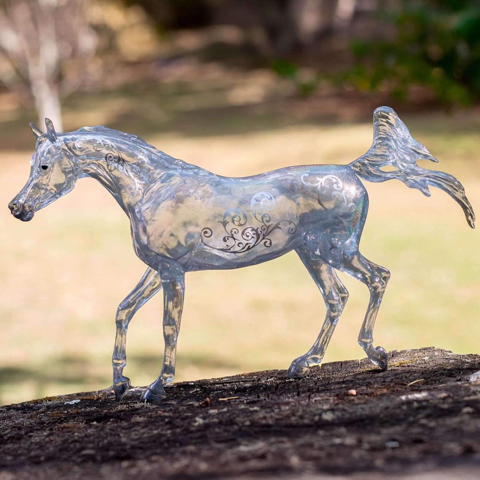 This striking Arabian mare sparkles in an array of prismatic colors and is adorned with a glittering teardrop-shaped rhinestone, fully embodying the sparkle and majesty of the diamond.