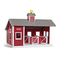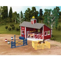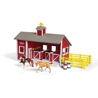 Made of durable plastic, this three-stall barn features a storage area and comes with four corral fences, a jump, water trough and three racing barrels.