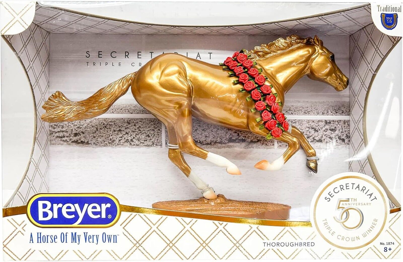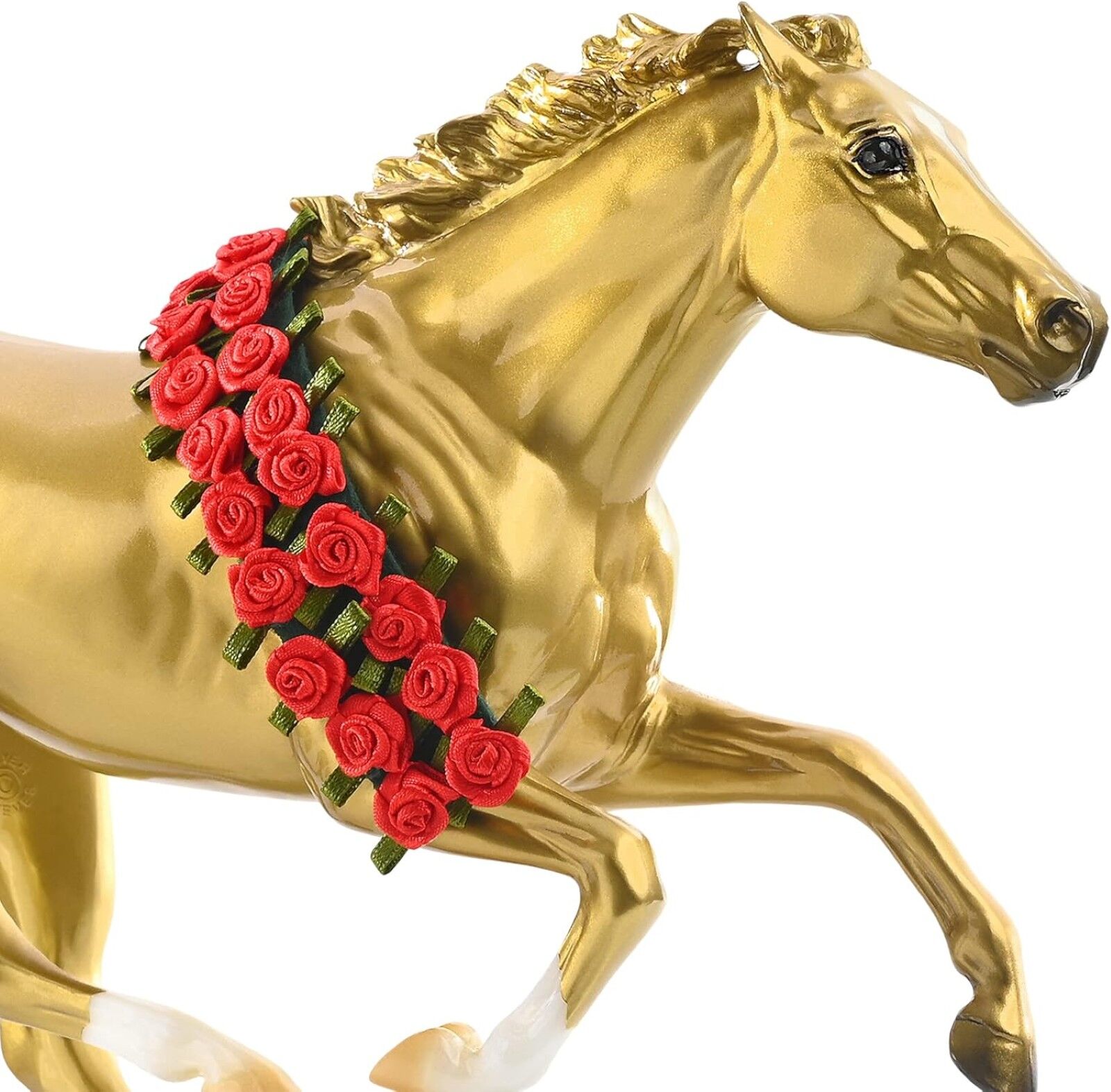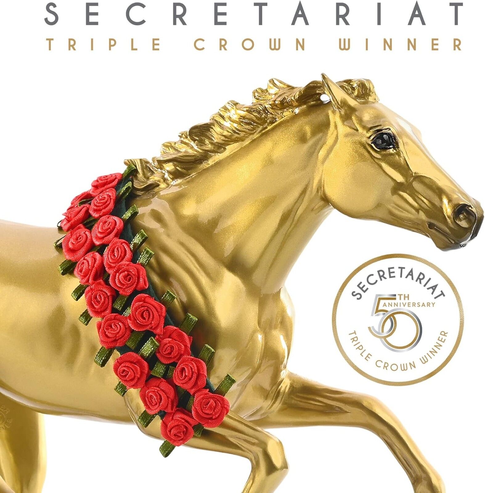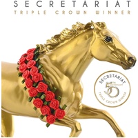 2023 marks the 50th anniversary of Secretariat’s iconic Triple Crown win. In celebration of this occasion, this special limited-edition Secretariat has been painted a glossy metallic gold, which is accented by his white blaze and leg markings. This shining emblem of racing history is adorned by a beautiful rose garland.
