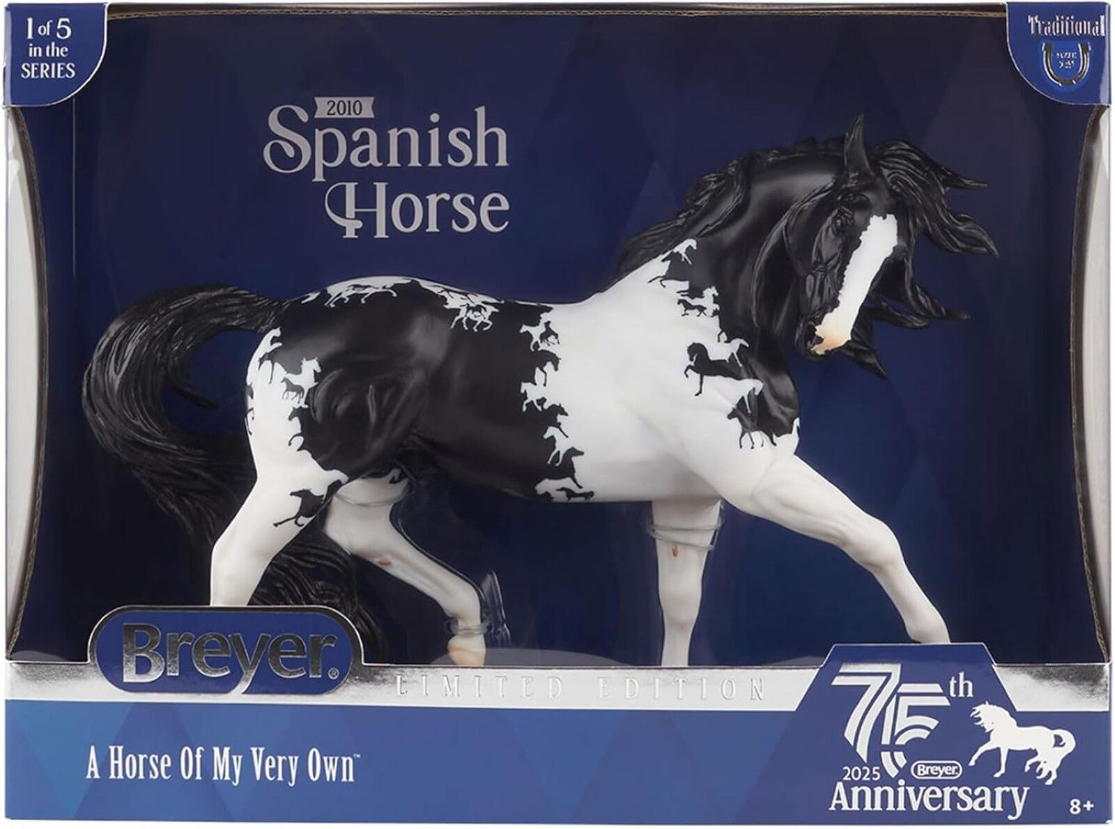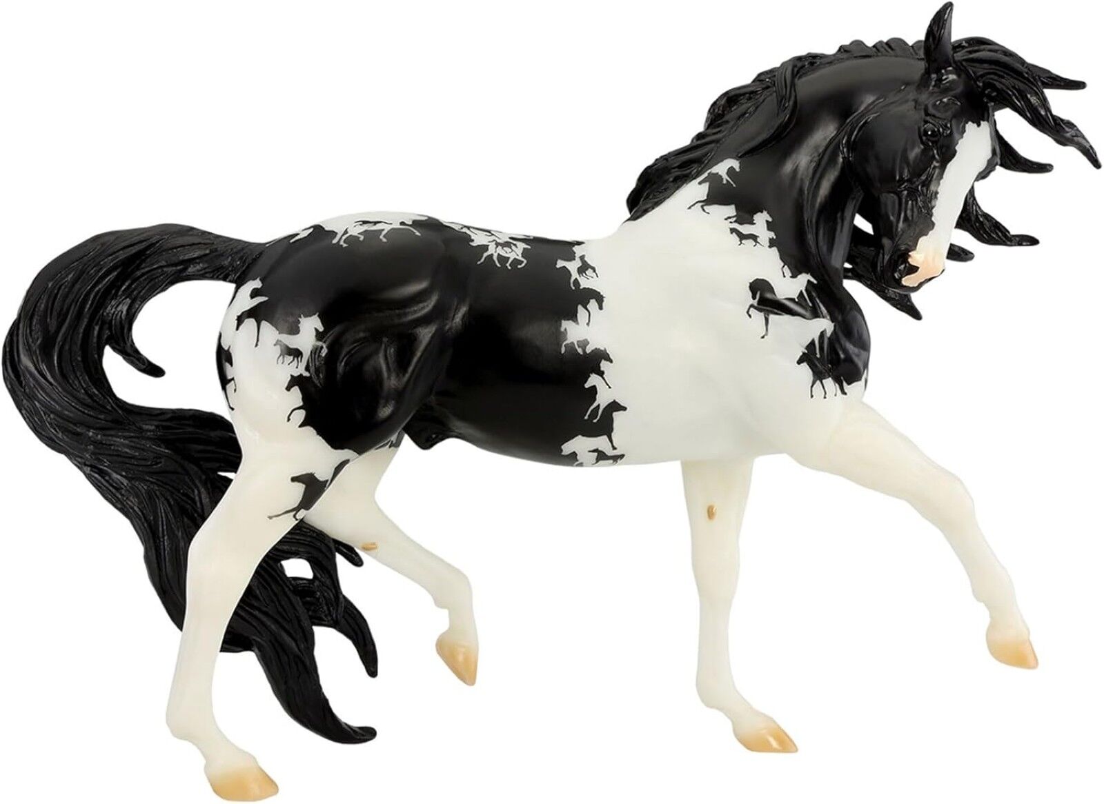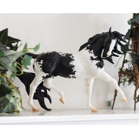 First introduced as the official model horse of the 2010 World Equestrian Games, this Spanish stallion, Esprit, was sculpted by Kathleen Moody and looks absolutely dashing in this unique black and white tobiano pinto.
