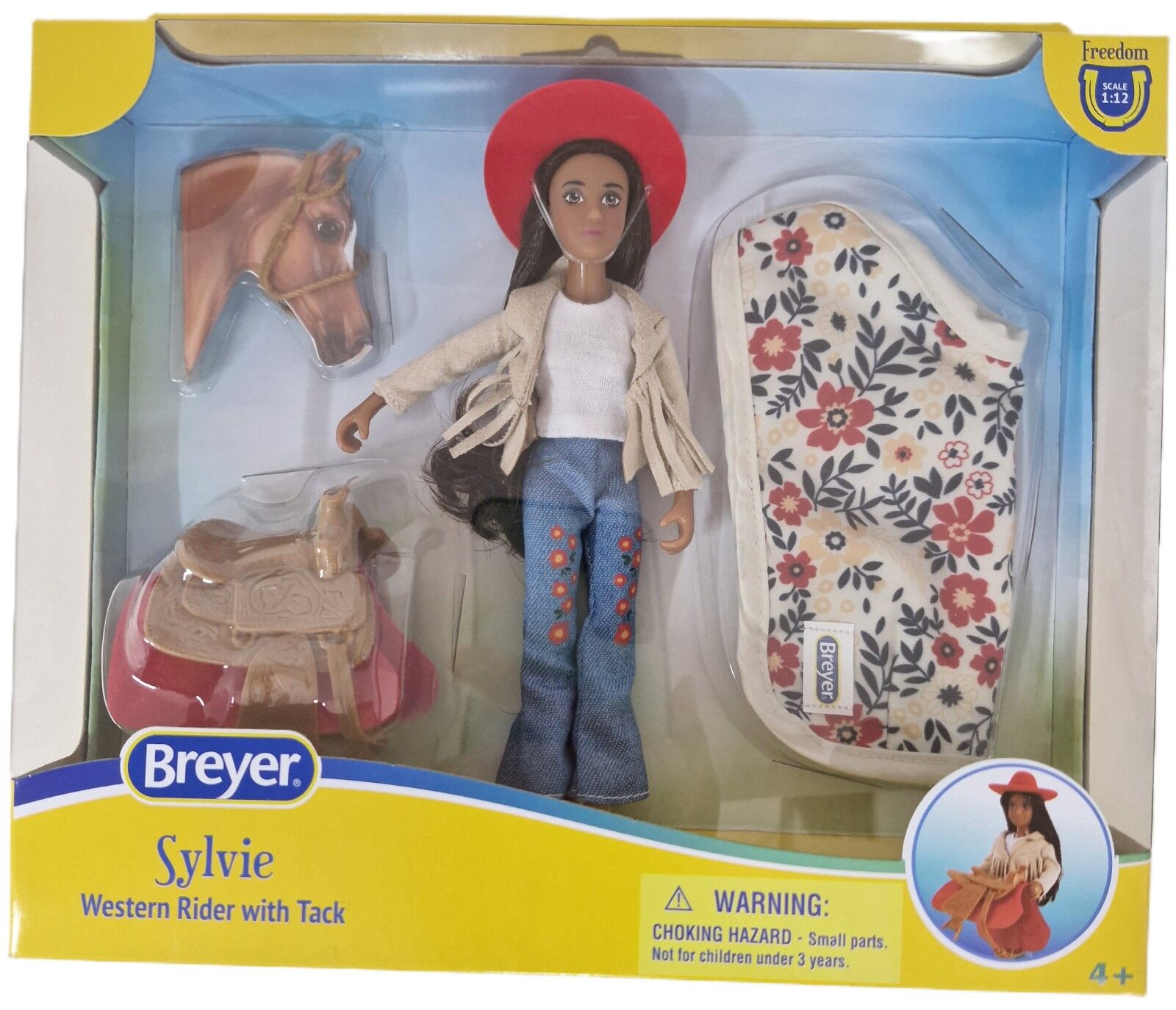 This set features a 6” articulated doll with brushable hair, floral jeans, fringe jacket, cowgirl boots, and hat. The horse comes with a western saddle, saddle pad, bridle, and floral blanke - perfect for imaginative play and Western adventures.