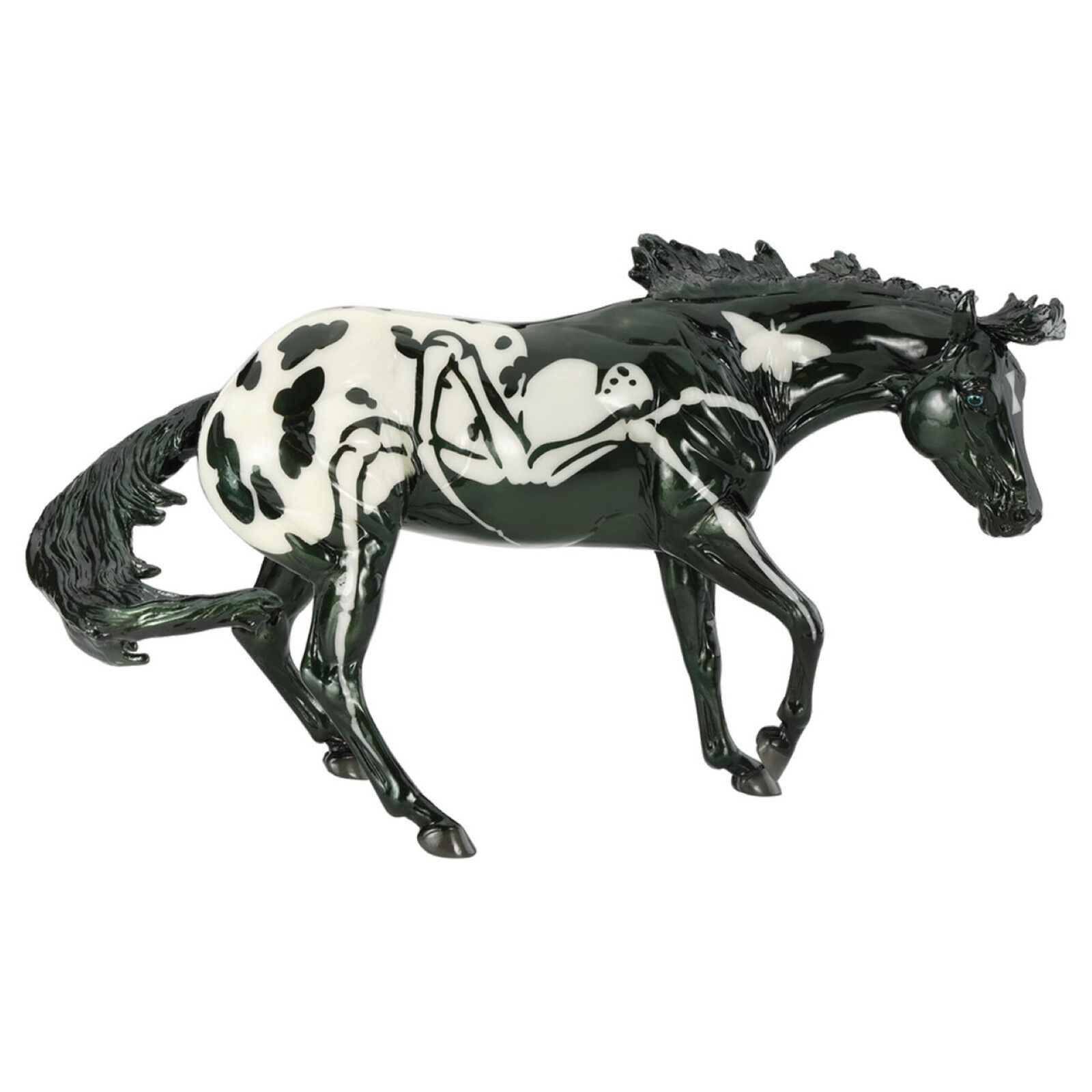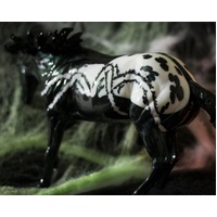 While she appears to have a flashy blanket appaloosa pattern from a distance, upon a closer look you’ll notice her blanket is made up of two large spiders on the prowl! A moth and firefly dance just out of their reach, flying to safety… this time. A subtle black widow marking on her face is a warning to those who look closely enough that they may be the next to be ensnared in her web. Turn the lights off, and all her white markings glow in the dark!