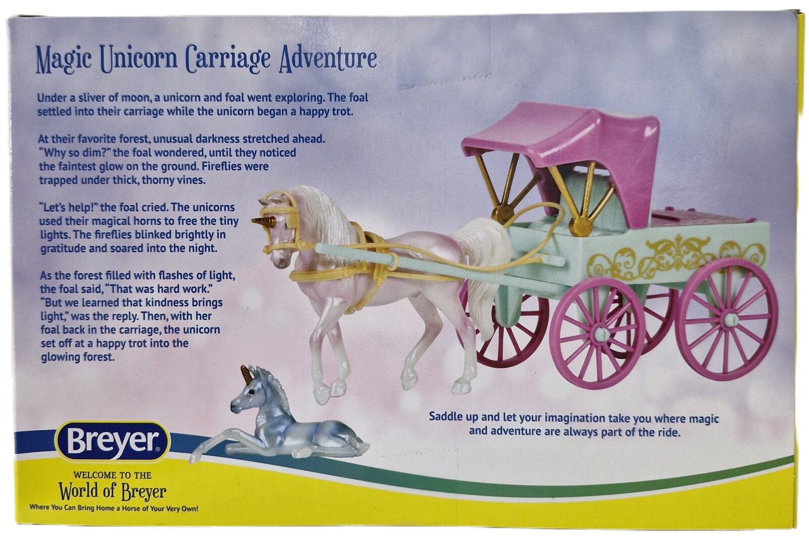This whimsical set includes a unicorn, foal, bridle, harness, and a detailed carriage with canopy - perfect for imaginative adventures and storytelling.