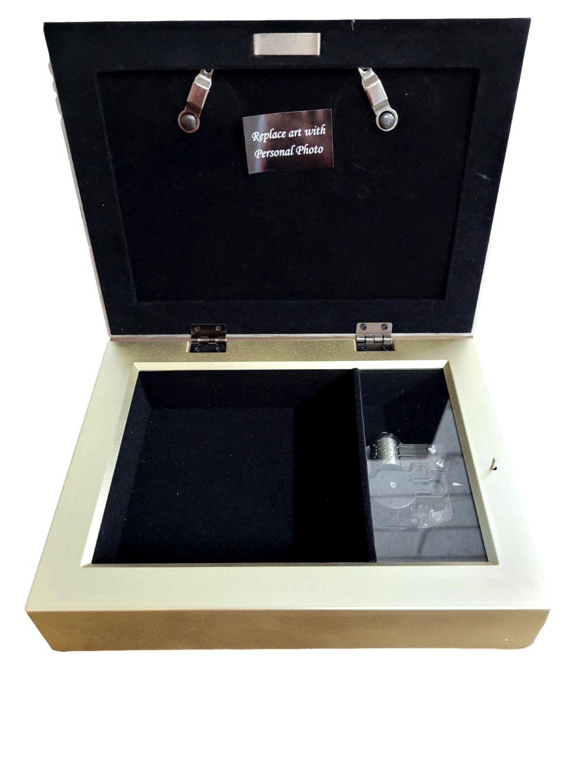 A traditional wind-up music box with a hinged lid and photo frame and sweet sentiment artwork gives this music box timeless appeal. Use the photo opening to add your own special touch of personalisation.
