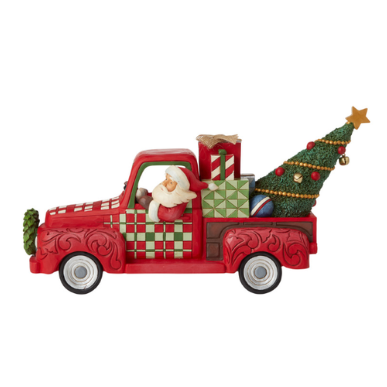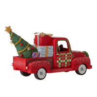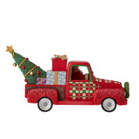 Santa ditches his sleigh for a red pickup truck this Christmas. Delivering all manner of presents and trees in style, this Jim Shore Santa pulls into your town spiritedly. With wind in his beard, he's thrilled to be out on the road this season.