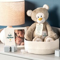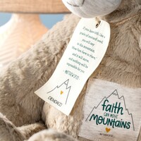 A new take on a classic favorite: a plush activity toy that supports development and creativity during playtime! This brown Faith Can Move Mountains Bear Plush will soon become your baby's favorite. A thoughtful gift for a new or expecting parent.