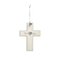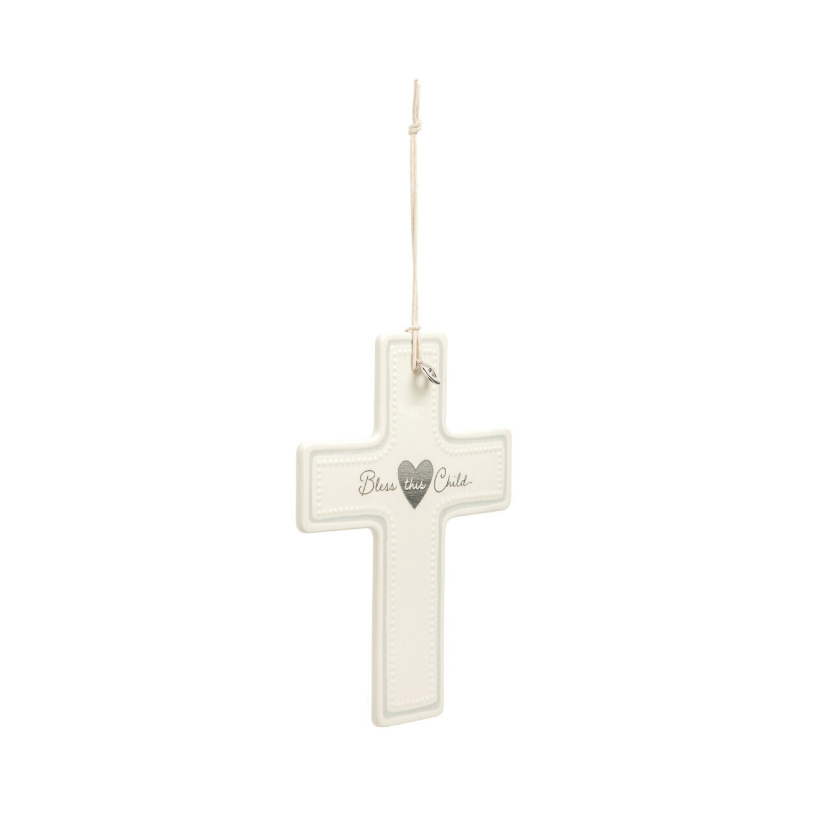 • Cross is made of glossy ceramic stoneware with a classic white and soft neutral border finish; Accented by a shimmering silver charm, raised dots, and a sculpted border
