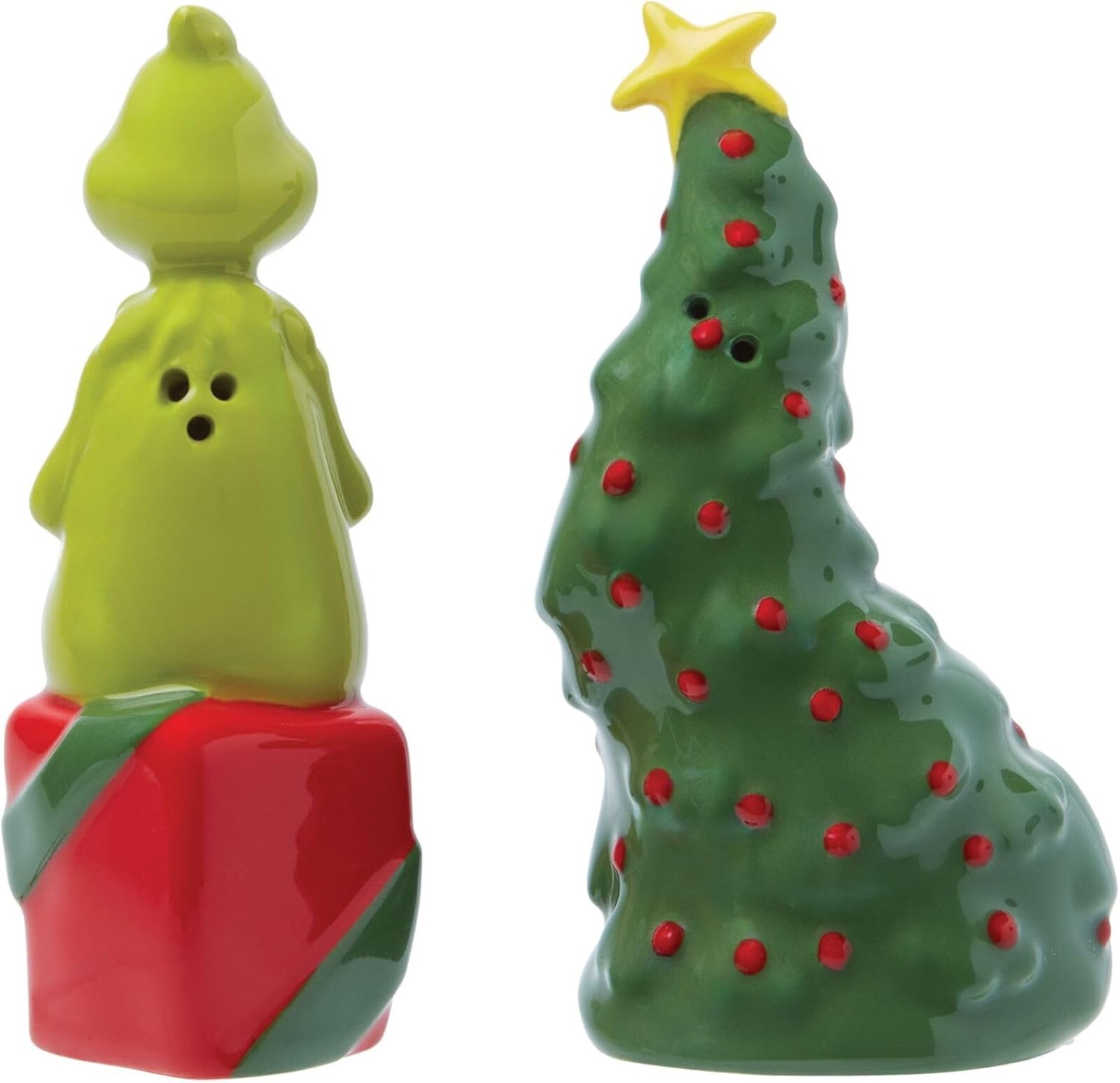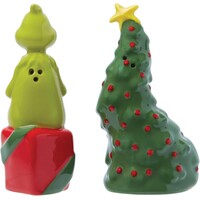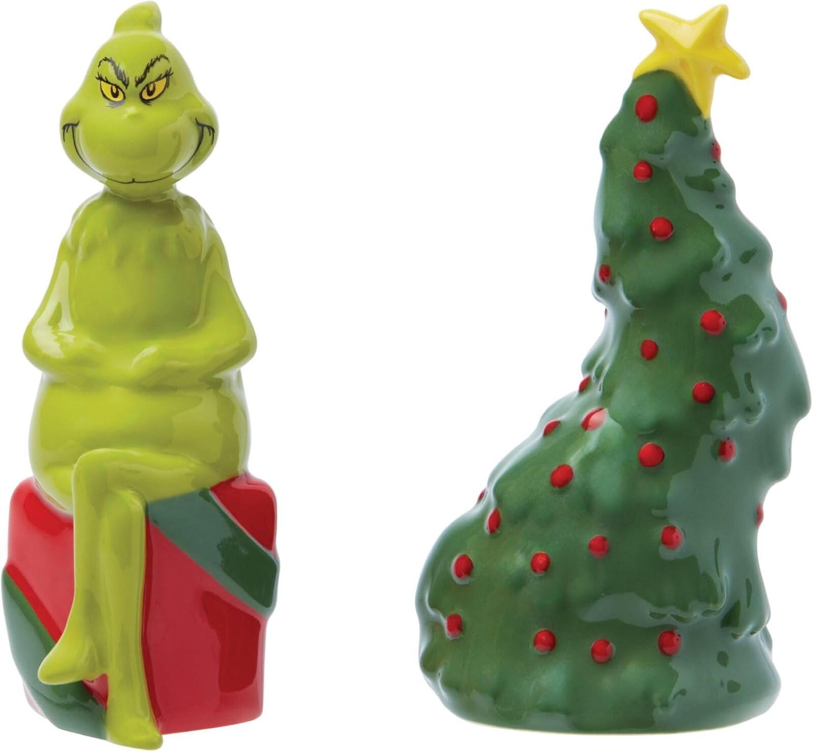 • Two piece set includes shakers of the classic Dr. Seuss character the Grinch sitting on a wrapped present and a wonky Christmas tree
