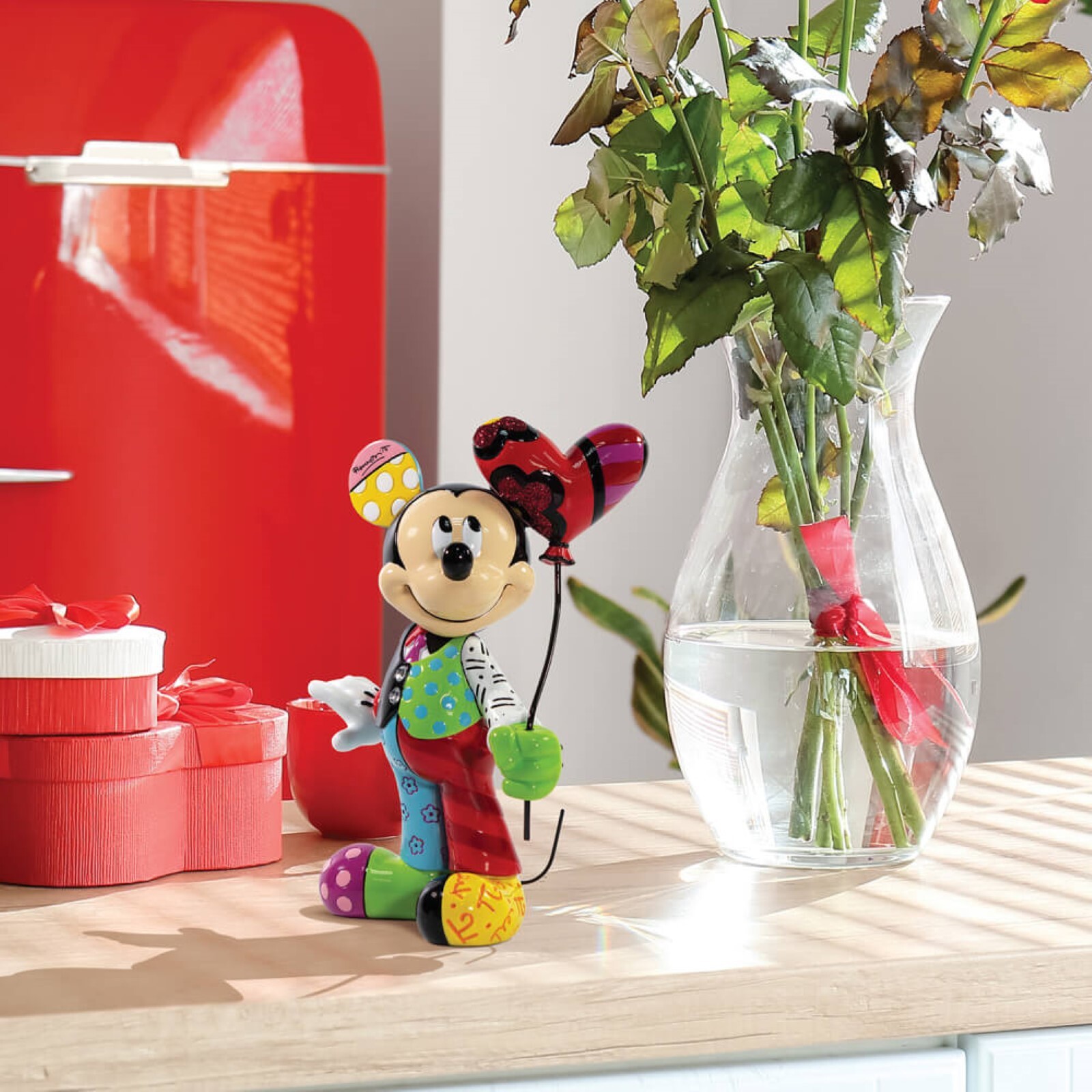 Wearing pants, a shirt and tie and a waistcoat finished with glistening jewelled buttons, and of course, his iconic gloves, Mickey is holding a heart-shaped balloon with red glitter accents, with his eyes gazing upwards in this captivating, commemorative figurine.
