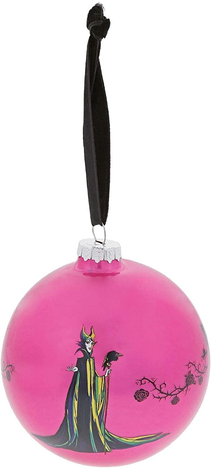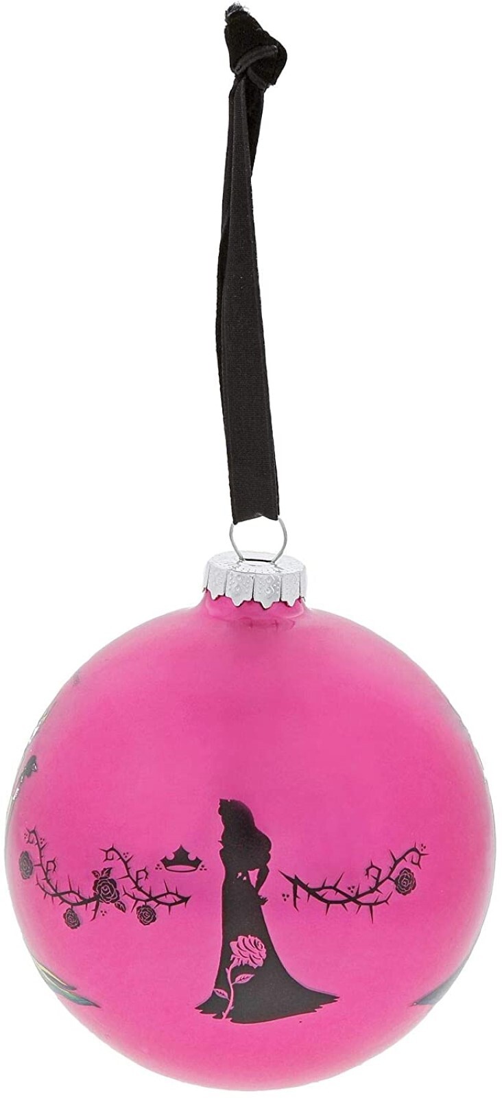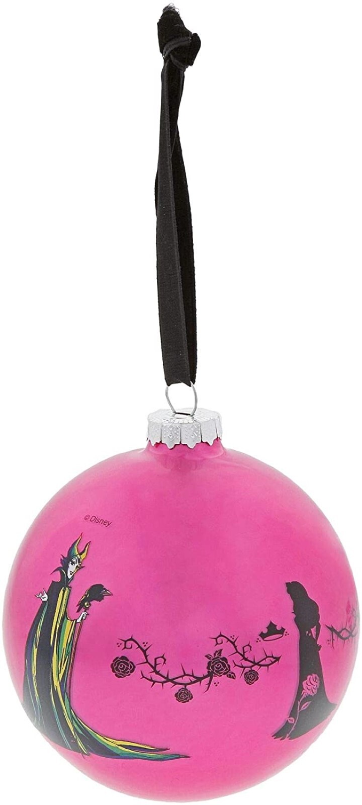 The Mistress of Evil, Maleficent stands out against the Princess Aurora amongst a forest of thorns in this glass bauble. This is a fabulous Sleeping Beauty bauble