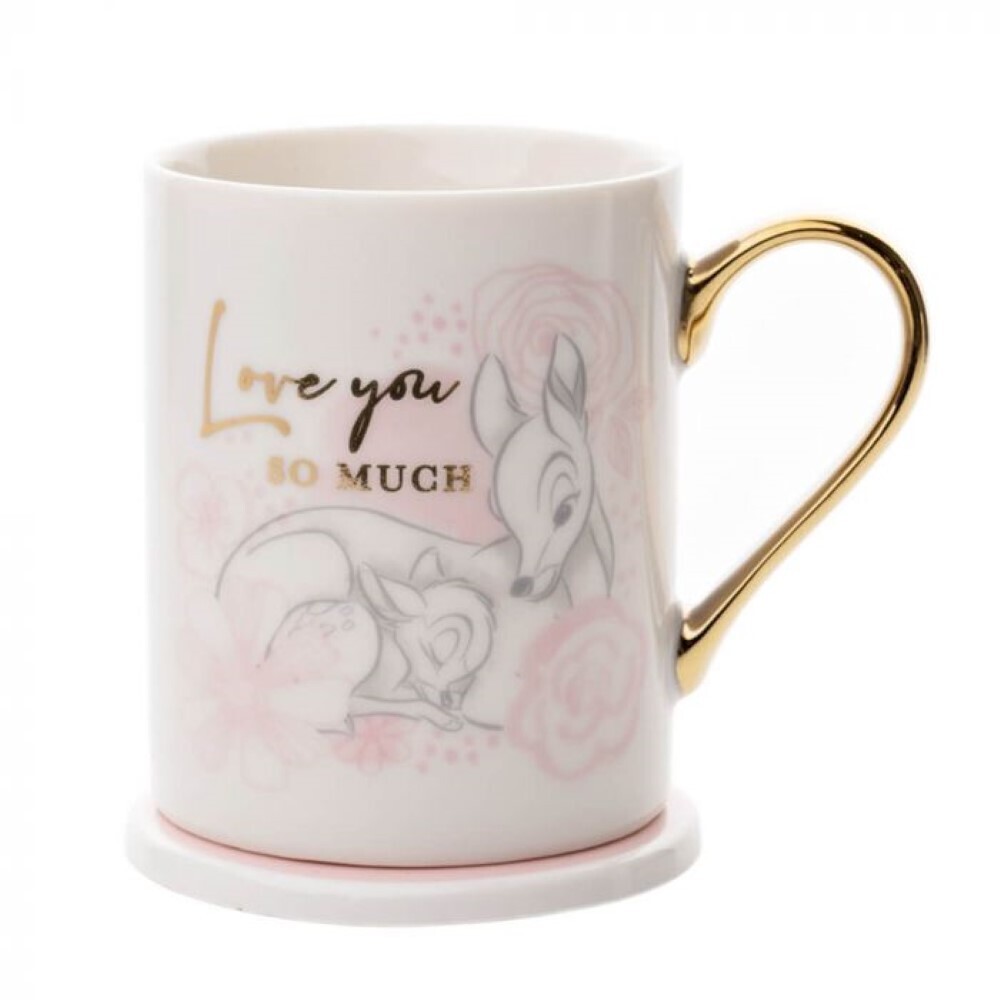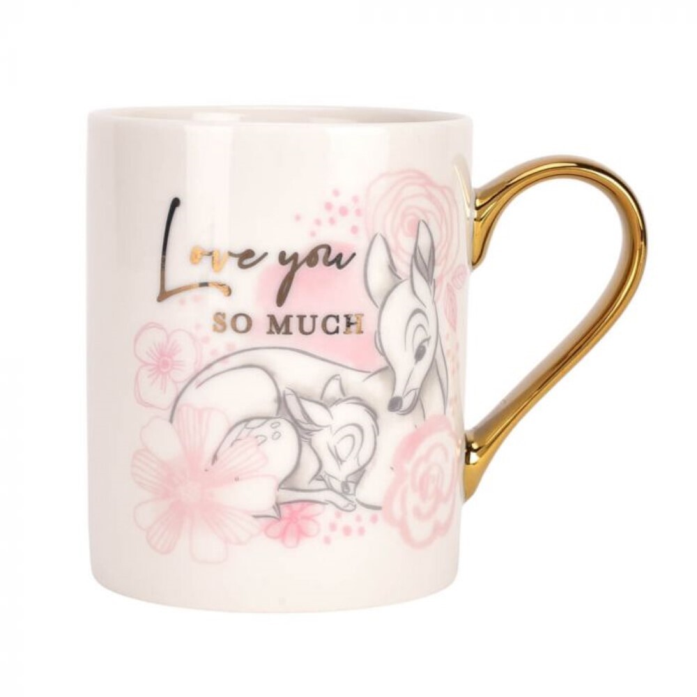 Mum and Nan will be delighted with their favourite beverage served in this gorgeous Disney mug. A beautiful classic white mug with a gold handle, featuring illustrations of Bambi and his mother, beautiful floral patterns and gold foiled captions "Love You So Much".