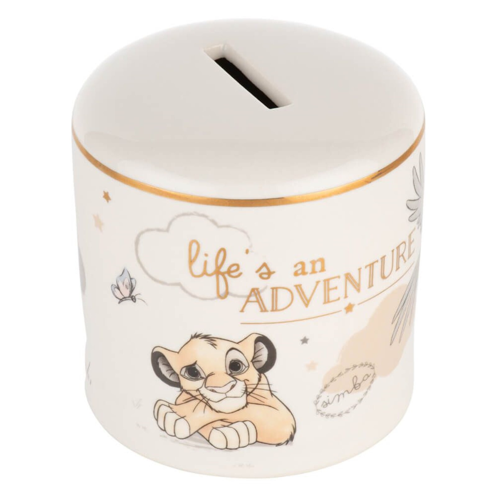 Make every beginning a magical one with Disney. This gorgeous little money bank features an illustration of Simba with the sentiments in gold foil lettering 'Life's an adventure'. This lovely money bank would be the perfect addition to a nursery or a wonderful keepsake to treasure for many years to come. Caption reads: 'Life's an adventure'. Presented in a gift box.