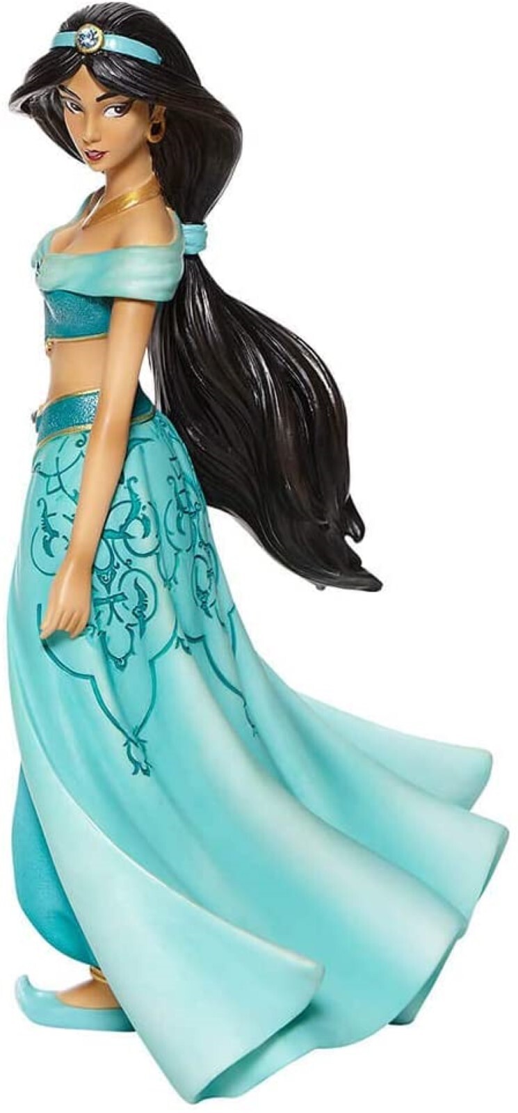 Princess Jasmine strikes a pose worthy of 1000 Arabian Nights. In a contemporary updated style, Jasmine's costume subtly spans color gradations of sky blue, turquoise and teal contrasting with her olive skin. Off-shoulder straps and flowing waistcoat sheen with a satiny finish while her bodice and V-shaped waistband have a textured surface achieved through sculpting techniques.