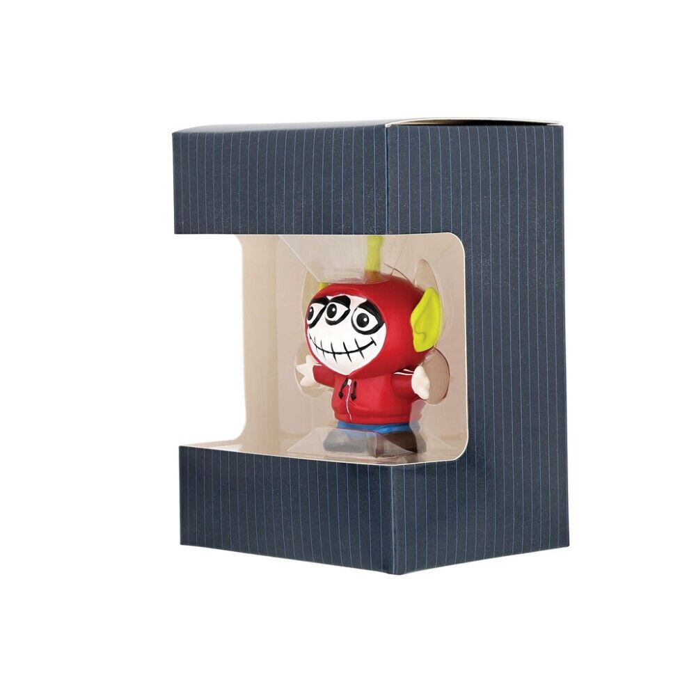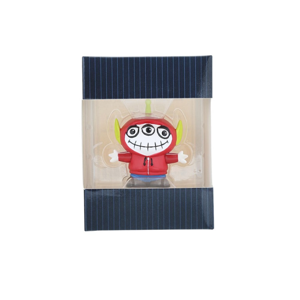 The Pizza Planet aliens seem to be attending a Pixar party this evening. Masquerading as their favorite characters, the aliens don an array of Disney disguises. This one dresses as Coco with signature red hoodie and skull makeup.