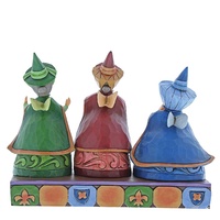 This beautifully detailed figurine captures the happiness of Aurora's three fairy guardians wearing their signature colors in gowns reimagined with gorgeous rosemaling detail as Aurora has her happily ever after with her handsome prince thanks to them.
