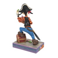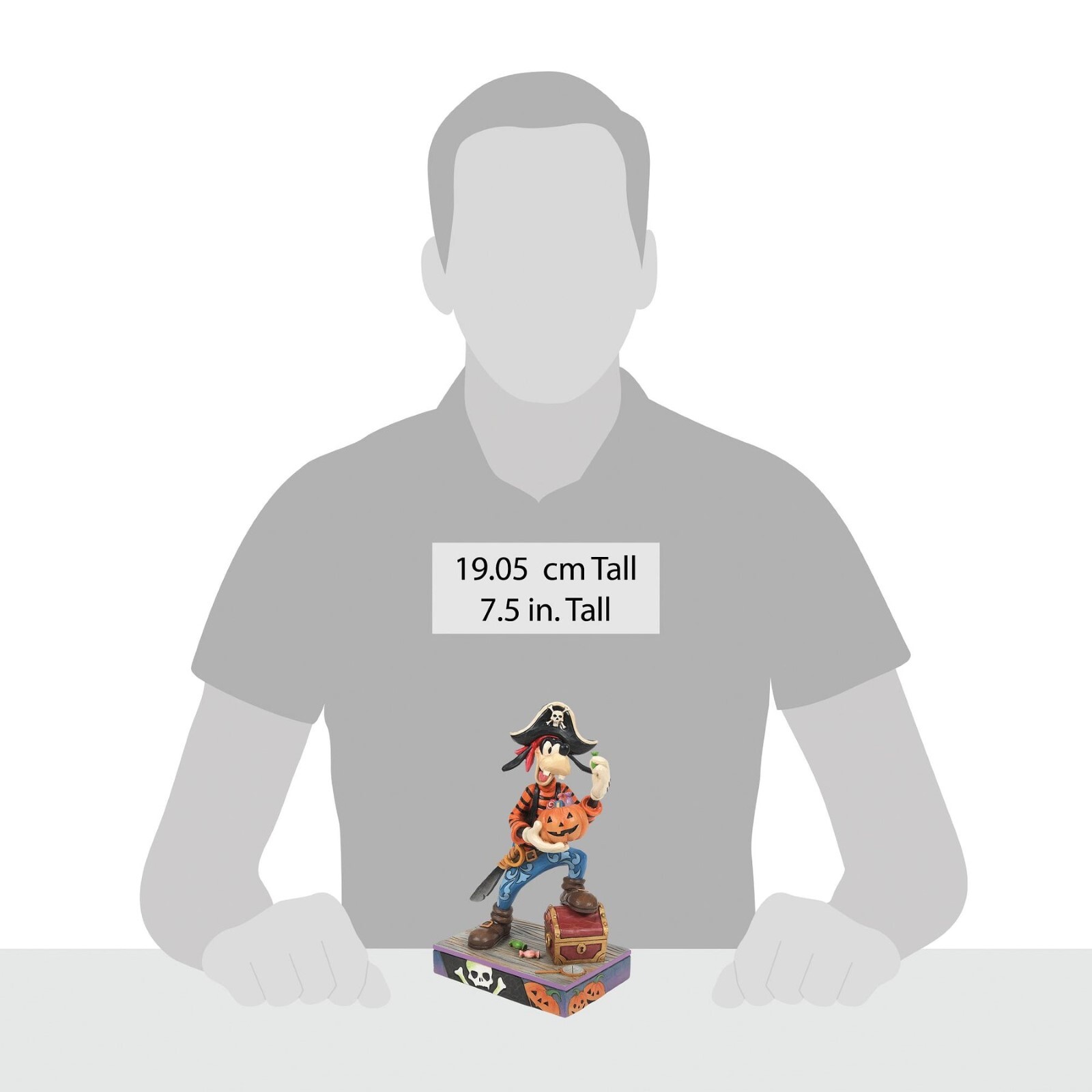 Celebrate Halloween with the Disney Traditions collection by Jim Shore. Goofy is dressed as a pirate with swashbuckling garb and holstered sword. Wearing a skull and cross bones hat, Goofy stands on a treasure chest as he examines his candy hoard.