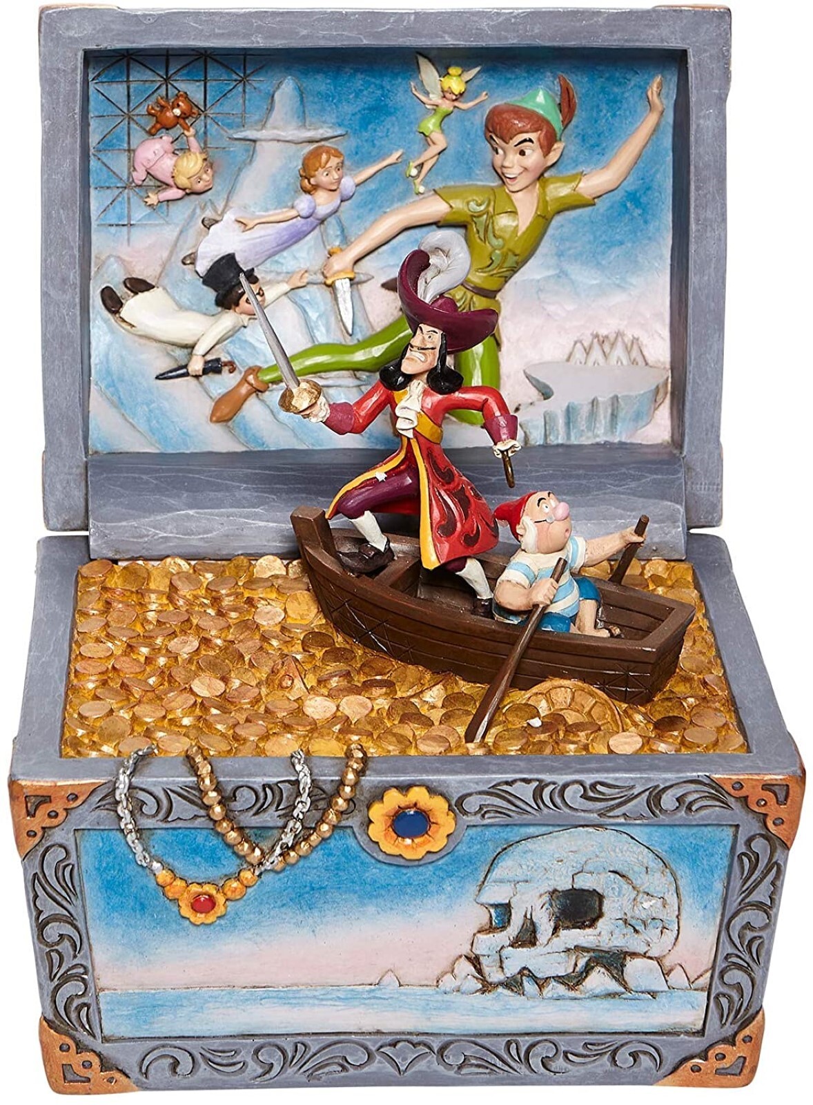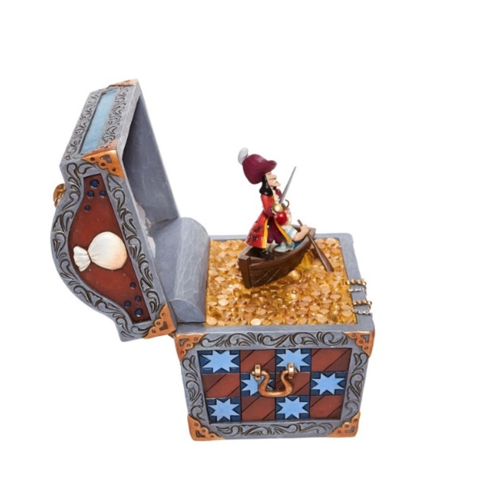 Inspired by the Disney classic film, Peter Pan, Captain Hook and his man Smee row across a golden treasure in a chest bearing the mark of Skull Island in this beautifully detailed scene from the artistry of Jim Shore.