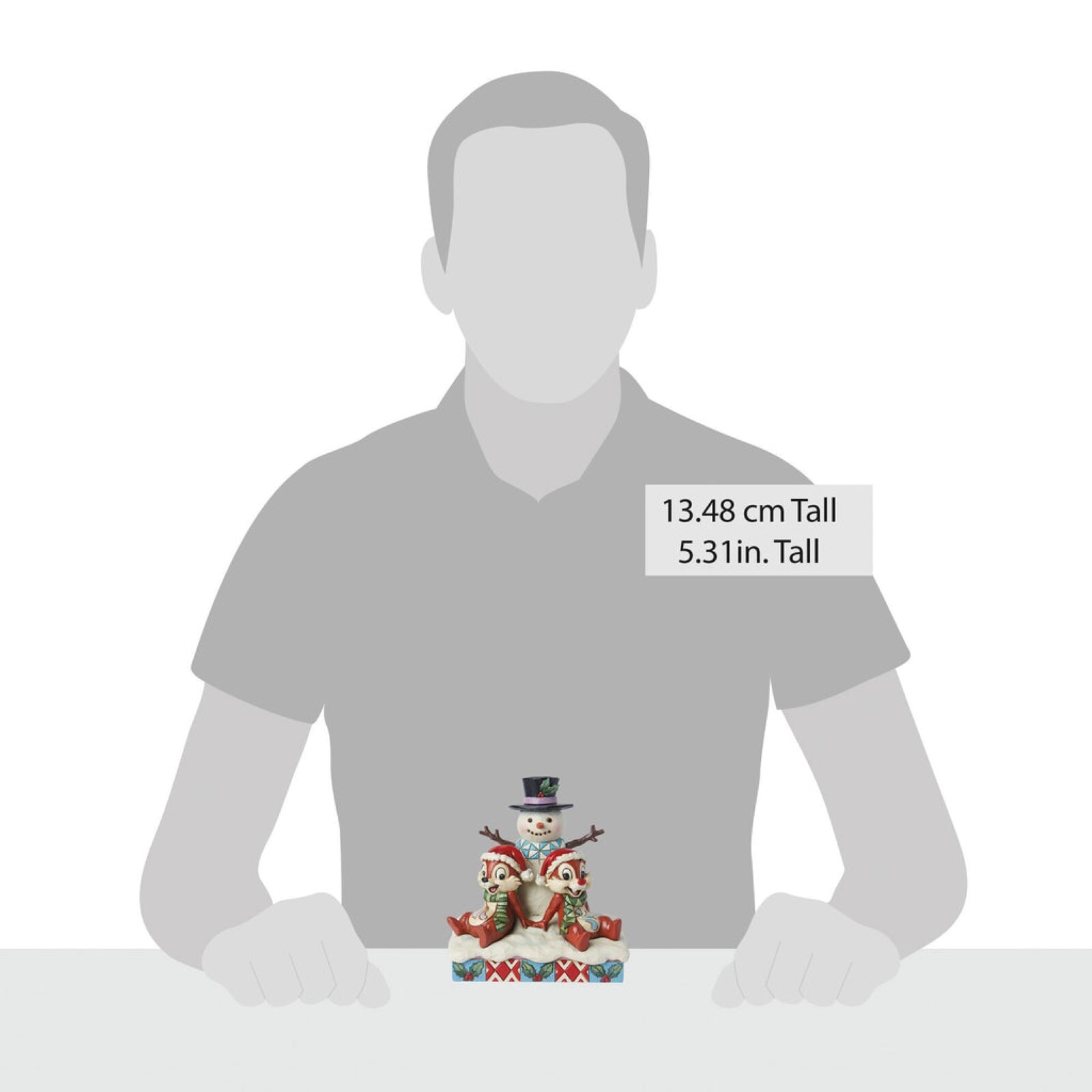 Created by Jim Shore, Chip 'n Dale relax in the snow after building a snowman with patchwork details and a mistletoe top hat. The brothers wear Santa hats with matching green scarves and playful smiles. Make new memories together this winter.