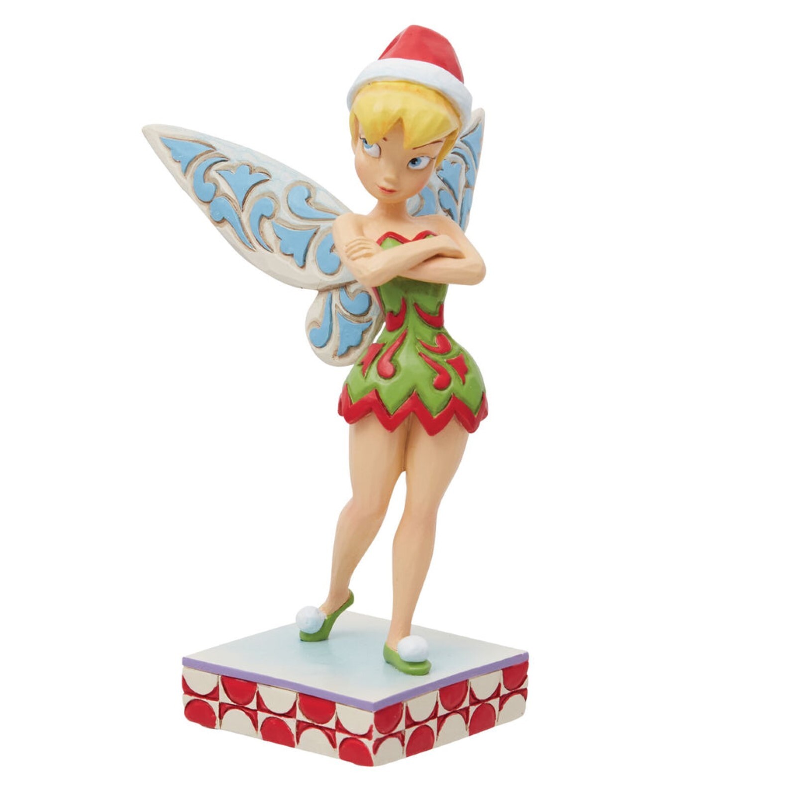 Arms crossed, this Tinker Bell Jim Shore design captures Tink's playful personality with color and craftsmanship. Wearing a dashing red and green rosemaled dress the fairy rocks a Santa hat with sassy style. With delicate wings she gives a pretty pout.