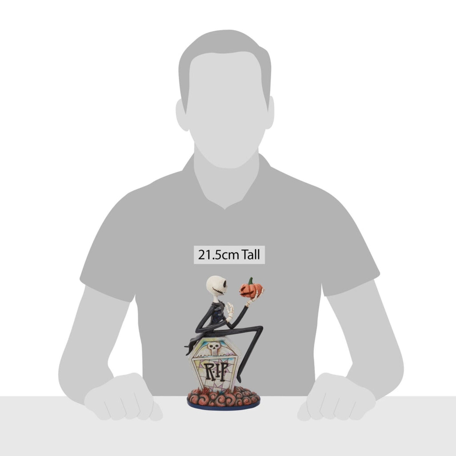 Sitting atop a tombstone, Jack Skellington has a To Be Or Not To Be moment with a jack-o-lantern. Eye to eye, he holds a pumpkin much like a skull and contemplates all things Halloween. This Jim Shore piece boasts patchwork details and endless charm.