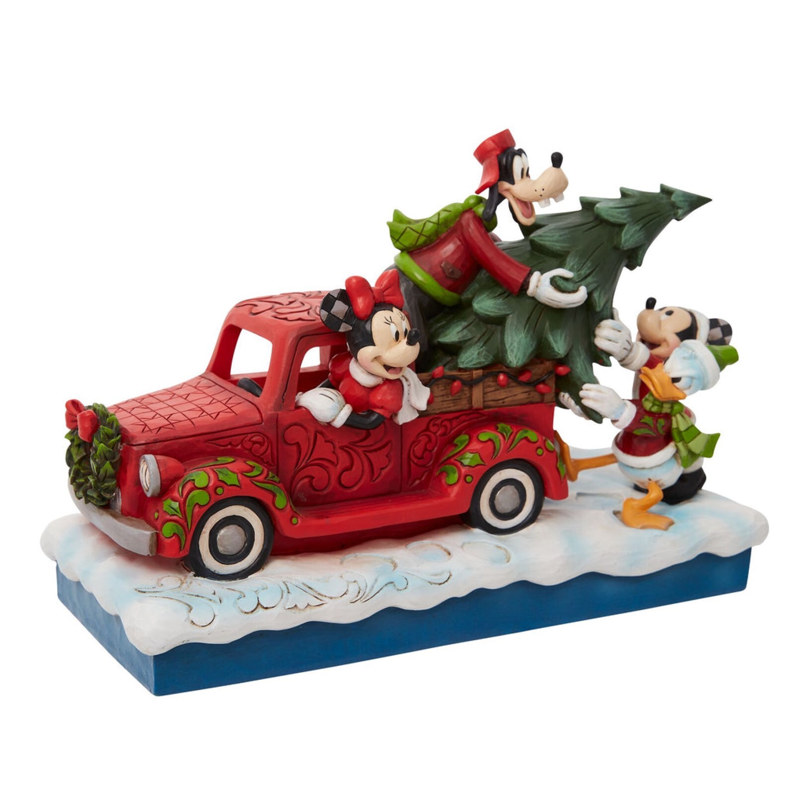 Loading a red pick up truck with a freshly picked Christmas tree, Minnie and Mickey Mouse pair up with Donald Duck and Goofy for a wonderful winter spent with friends in this Jim Shore design.