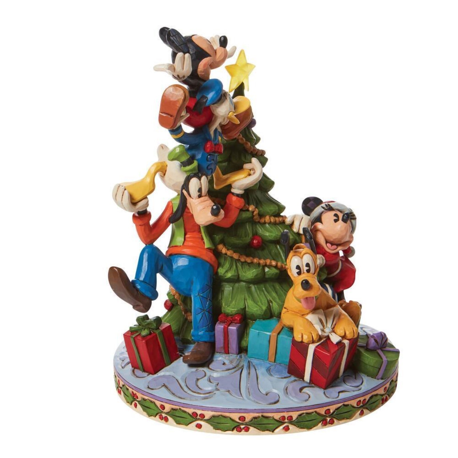 Mickey Mouse gets a hand and a boost decorating the tree this year. His friends form a teetering tower to hoist him to the top of the Mouse family tree while Minnie adds the finishing touches below in this Disney by Jim Shore design.  All of Mickeys friends are there, Minnie, Googy, Donald and Pluto