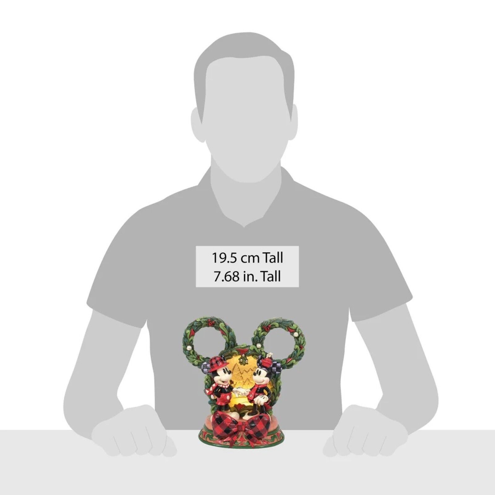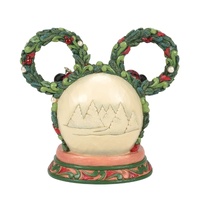 This delightful Jim Shore Christmas scene captures Mickey and Minnie holding hands beneath a glowing LED diorama, framed by a festive Mickey-shaped garland adorned with berries and pearl accents. It radiates seasonal magic with holiday charm.