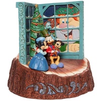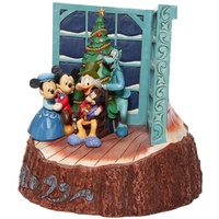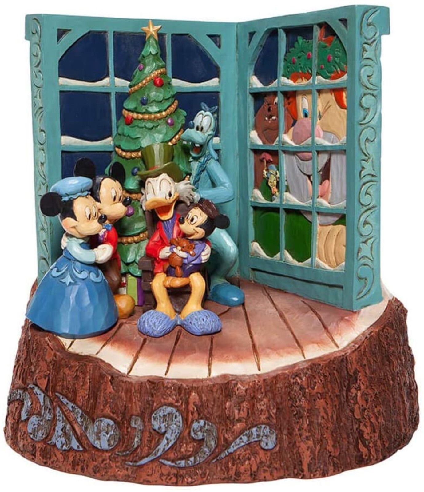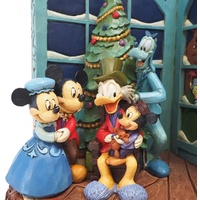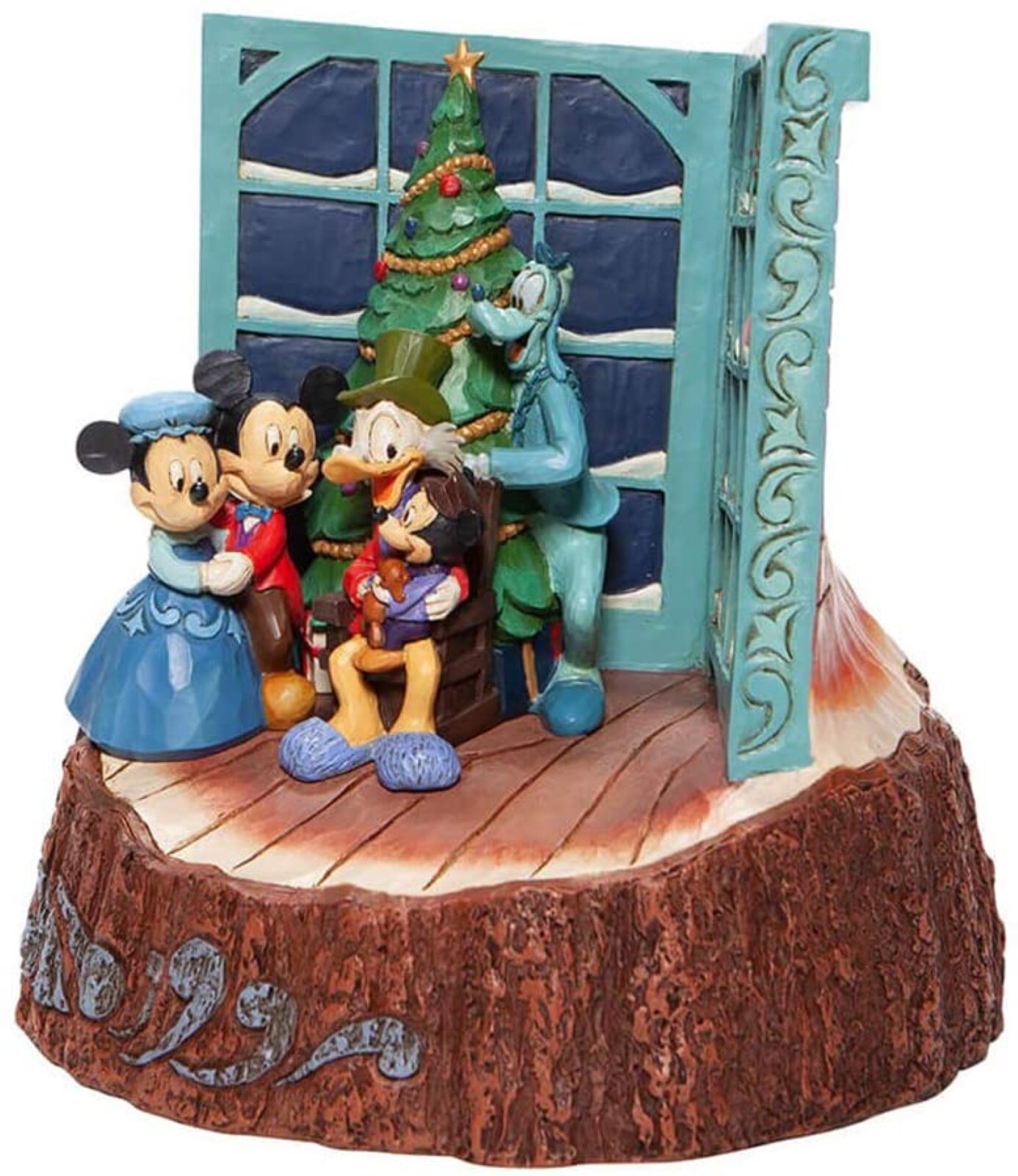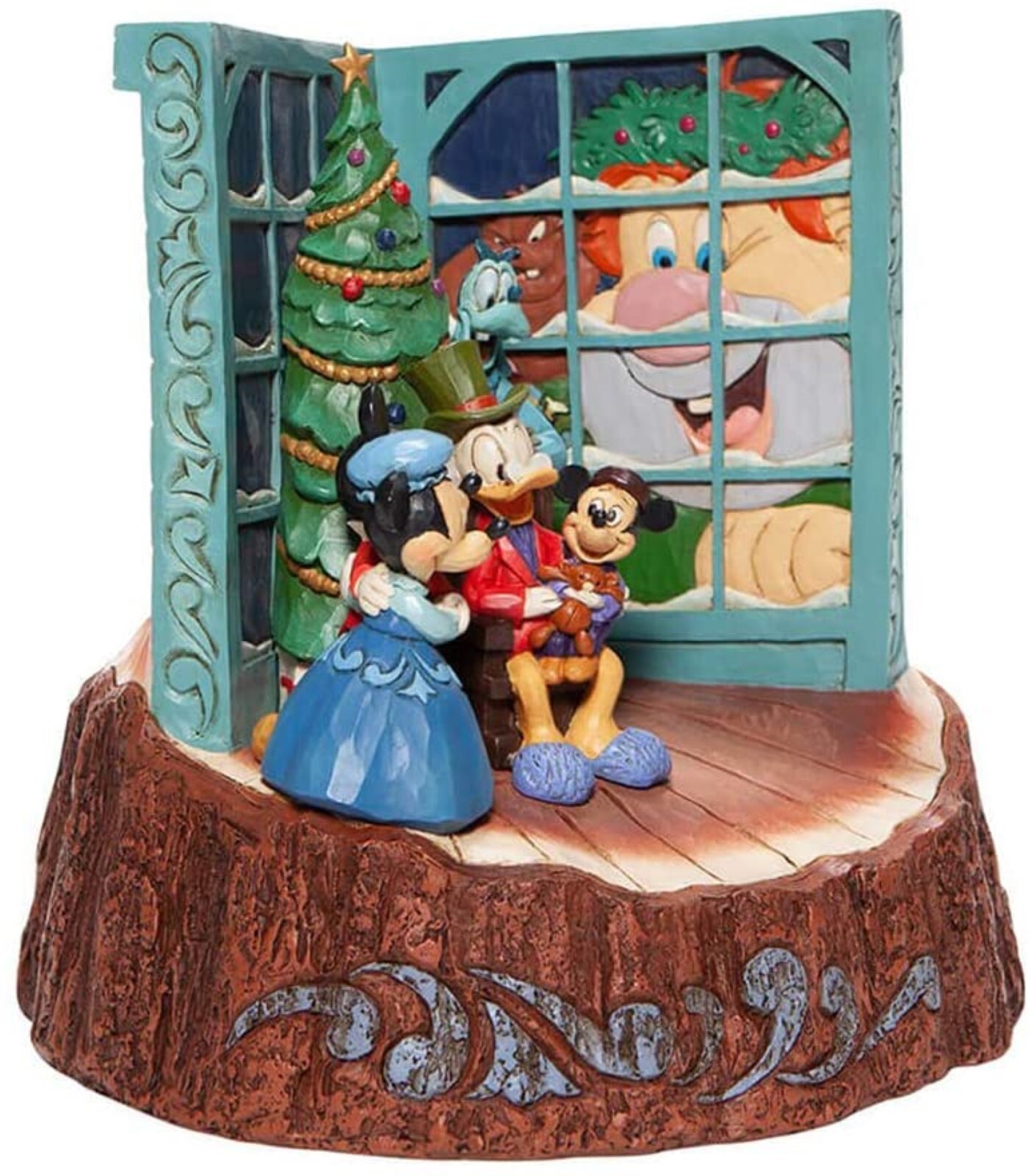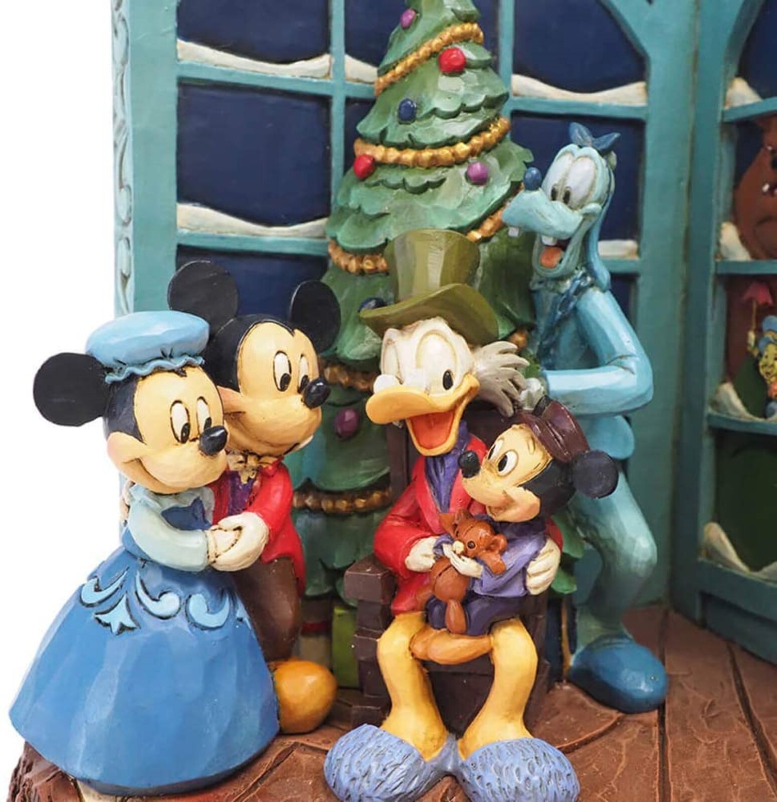 Mickey and family gather around the tree to witness a Christmas Carol retelling by Scrooge McDuck. With windows alight with narrative imagery, they're in for a treat celebrating Christmas past, present and future in this nostalgic design by Jim Shore