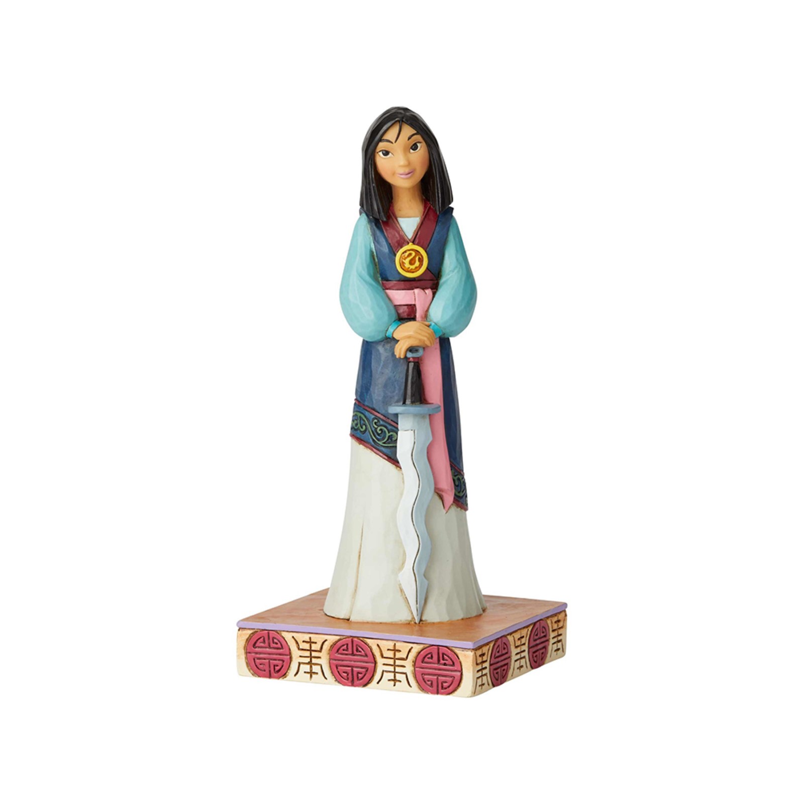 Mulan bravely enlists as a warrior to protect her father. Staying true to her courageous spirit, Mulan heroically saves China and brings honor to her family. In this inspiring Jim Shore design, she holds Shan Yu's sword and wears the Emperor's crest.