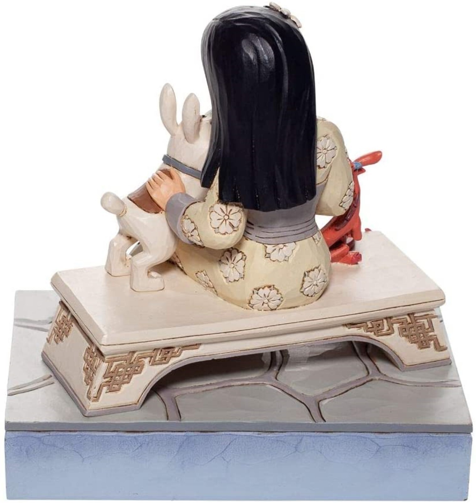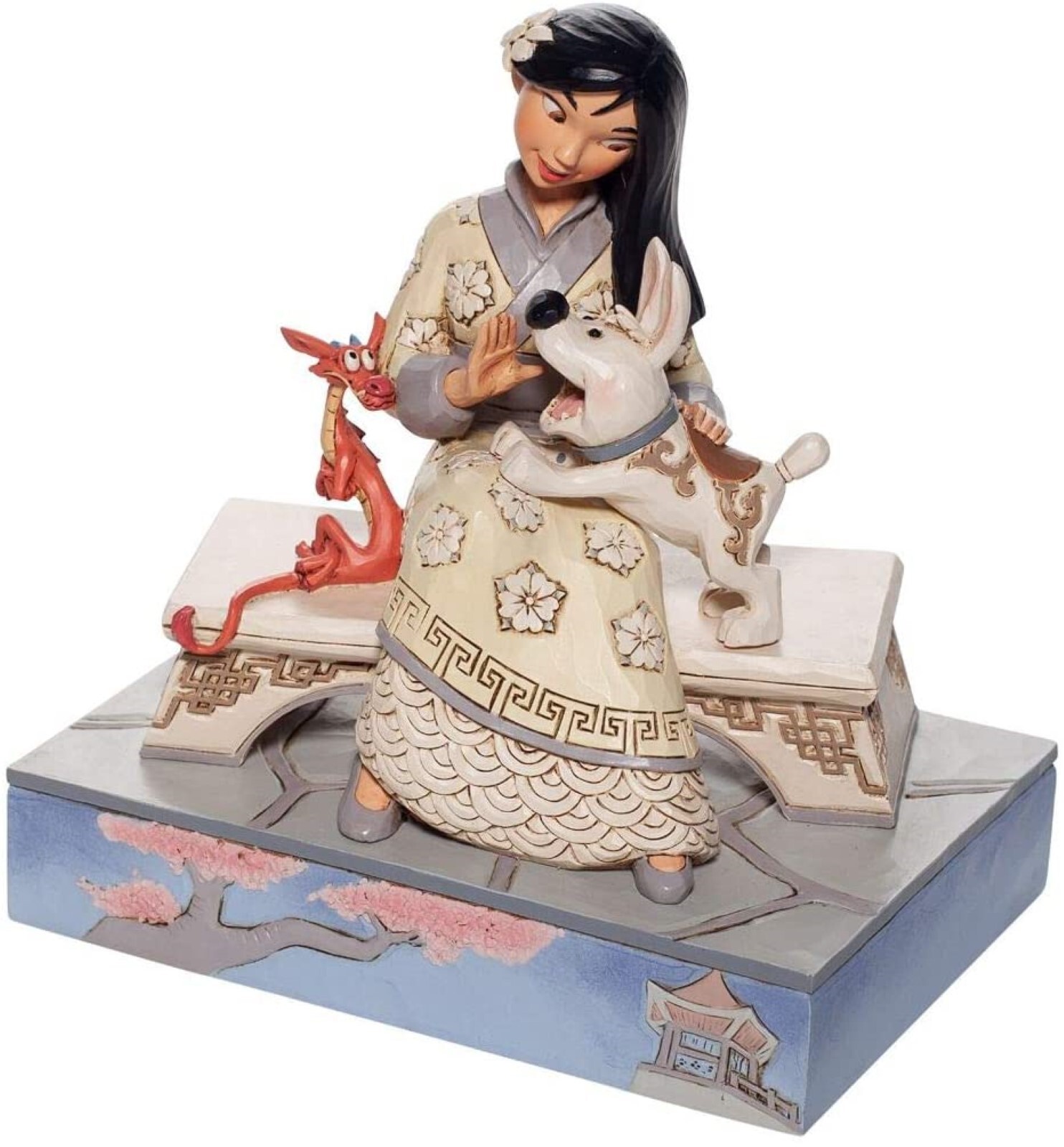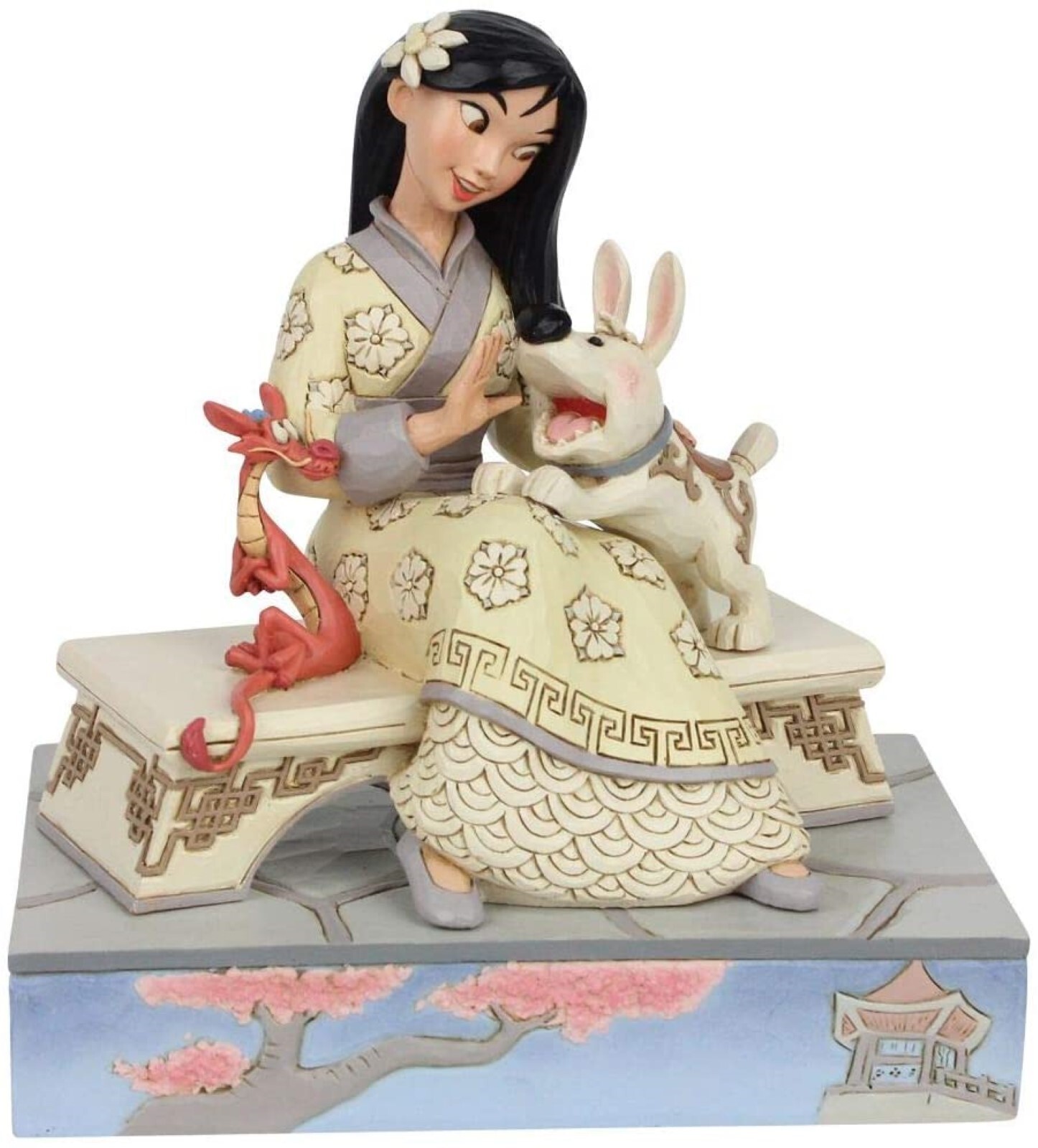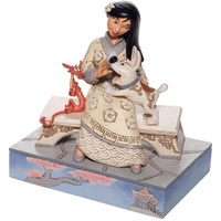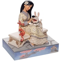 Mulan is breathtaking, sitting on a bench in her best dress. With her excitable pup, Little Brother, bouncing in her lap and her dragon guardian Mushu in a tight hug, she's surrounded by love. Beautifully sculpted, this Jim Shore piece is a classic.