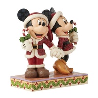 In this festive Jim Shore scene, Mickey and Minnie Mouse don Santa suits adorned with intricate rosemaling patterns and joyfully carry candy canes. Their bright smiles radiate holiday cheer, making the scene a delightful celebration of the season.