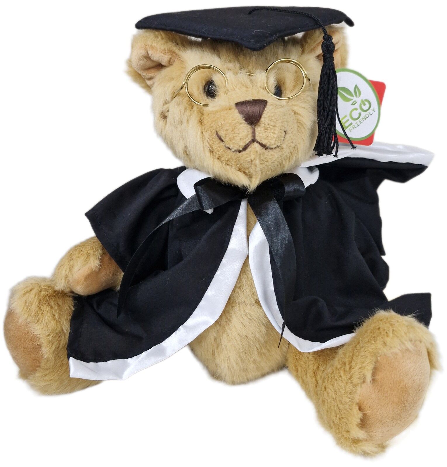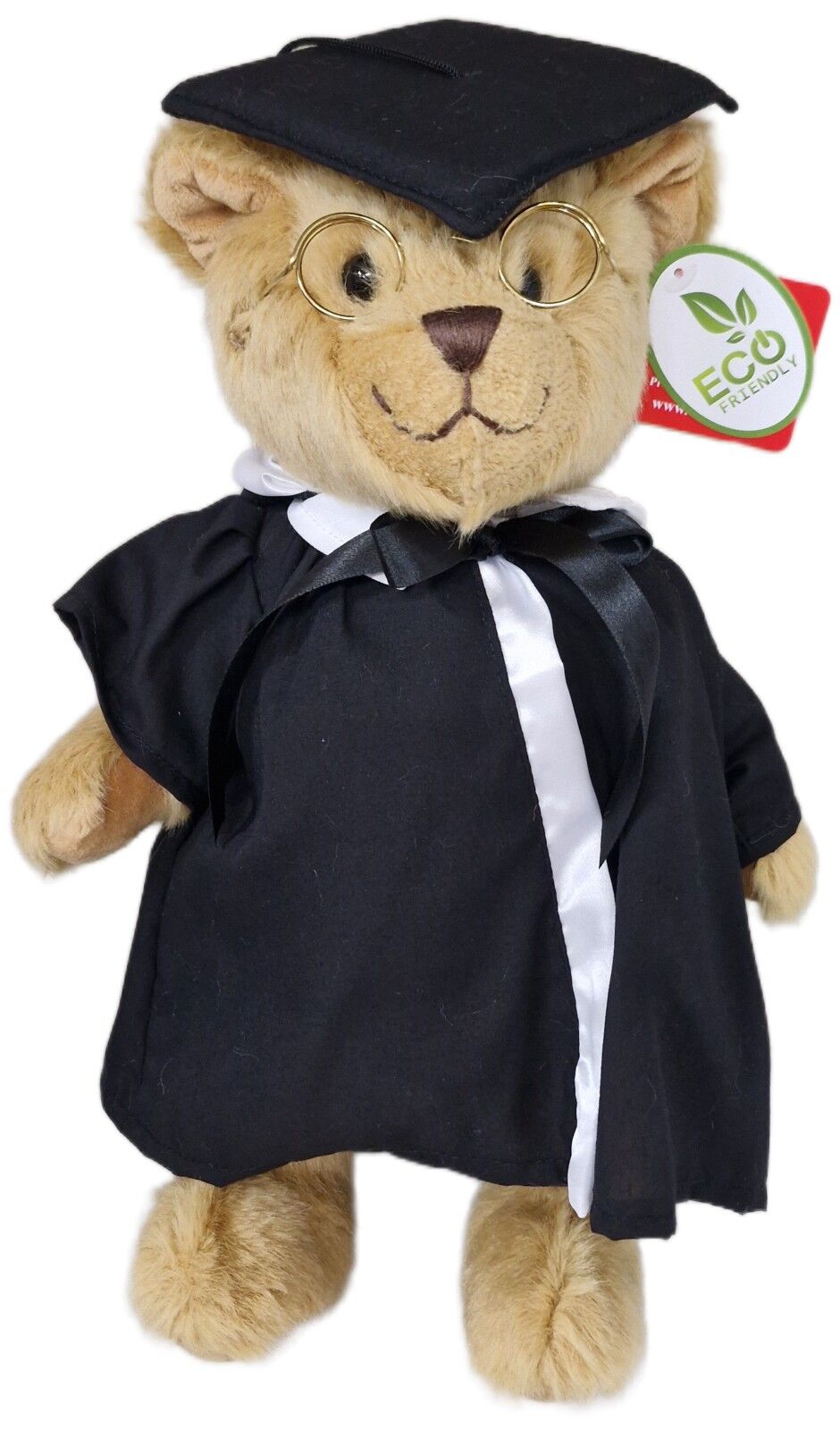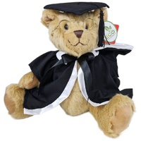 The Graduation Bear wears a gown tied at the neck with ribbon, a separate cape hood with neck elastic, a non removeable mortarboard and glasses.